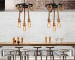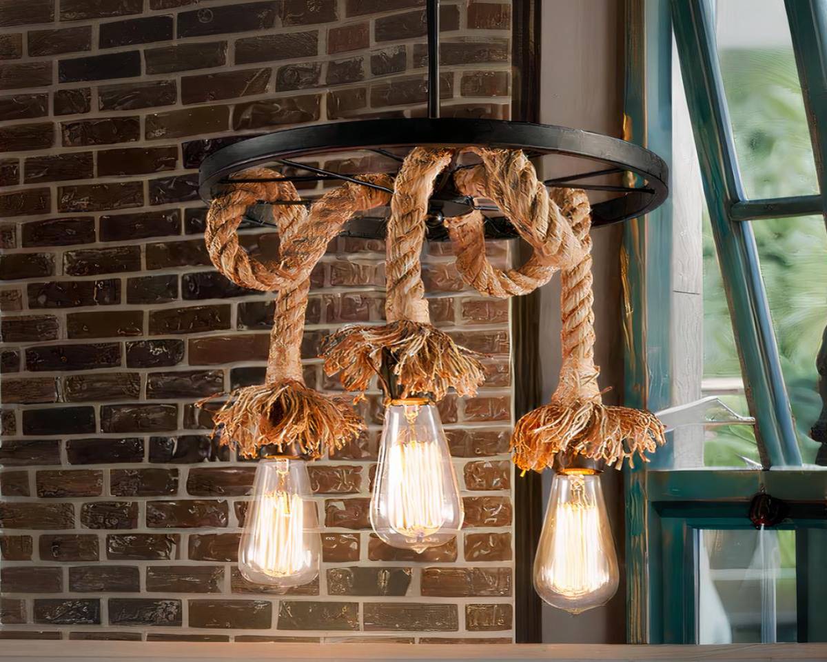 Profitez de la beauté du style vintage avec cette suspension à trois têtes. Parfaite pour une salle à manger ou un grand salon, elle distribue la lumière de manière équilibrée, tout en ajoutant un charme rustique grâce à son design en corde et fer. C'est un excellent choix pour ceux qui cherchent à combiner fonctionnalité et esthétique rétro.