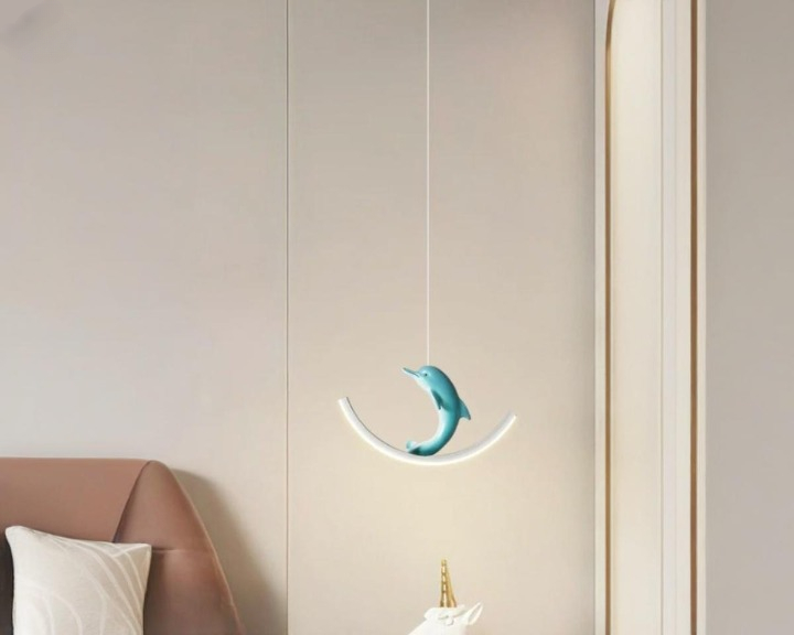 Plongez dans une ambiance marine avec cette suspension représentant un dauphin bleu, idéale pour éclairer et décorer la chambre de votre bébé. Son design moderne et la combinaison des matériaux créent une atmosphère calme et stimulante, où l'imagination des jeunes enfants peut naviguer librement. Parfaite pour accompagner les rêves et les jeux des plus petits.