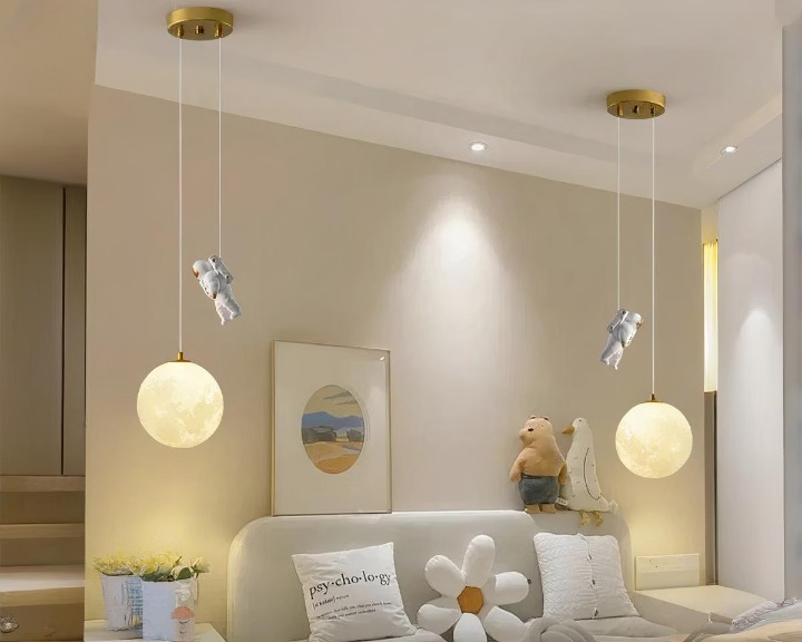Cette suspension décorative avec globe lunaire et astronaute transforme la chambre de bébé en un petit univers. Les détails méticuleux et la conception artistique de cette lampe encouragent une atmosphère de calme et de merveille, offrant une source de lumière à la fois pratique et inspirante. C'est un choix idéal pour ceux qui veulent combiner éducation et esthétique dans l'éclairage de chambre de leur enfant.