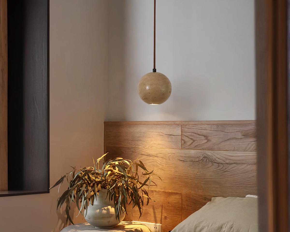 Élevez le style de votre chambre avec cette suspension en forme de boule, réalisée en pierre beige. Son design sobre, mais captivant imite la perfection naturelle des éléments terrestres, offrant à la fois une source de lumière efficace et un objet d'art décoratif. Idéale pour une chambre où le calme et la beauté sont de mise.