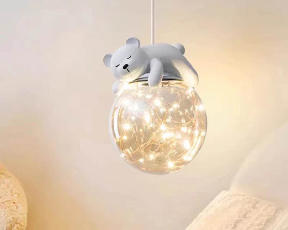 Cette suspension n'est pas seulement un luminaire, c'est aussi un stimulant pour l'éveil de l'enfant. Avec l'adorable ours blanc en vedette, elle encourage l'imagination et les jeux de rôle. Chaque fois que la lumière s'allume, c'est une nouvelle aventure qui commence, faisant de la chambre un espace propice au développement créatif.