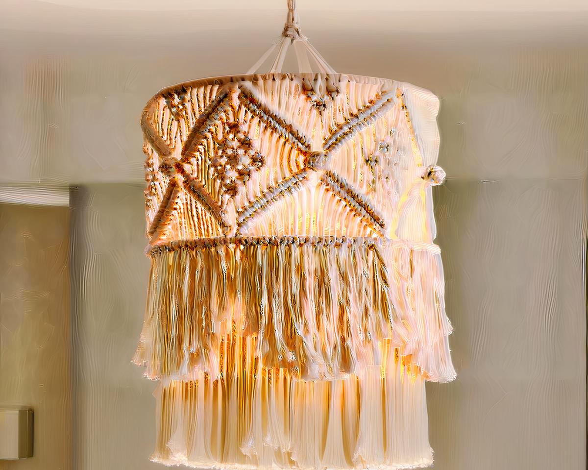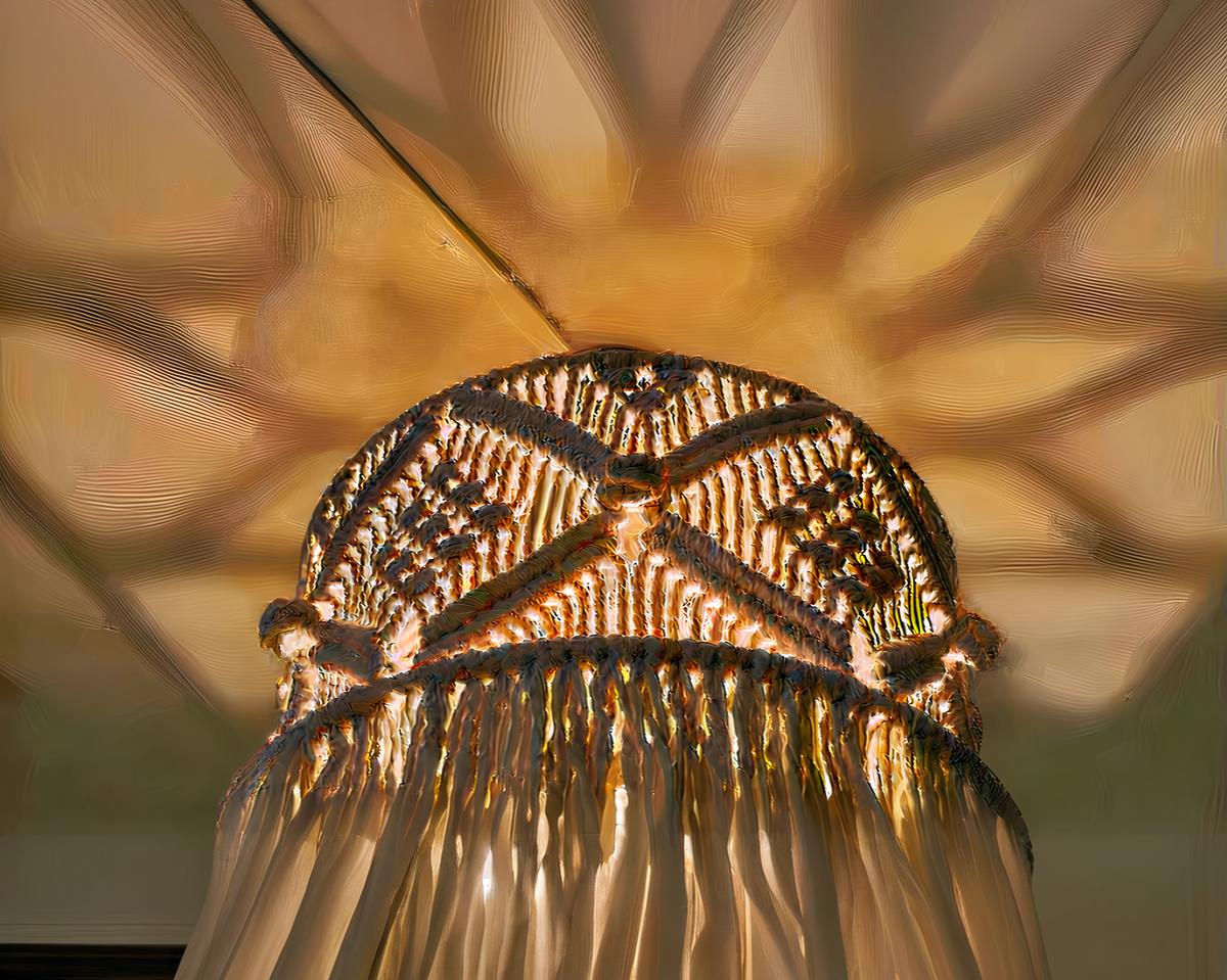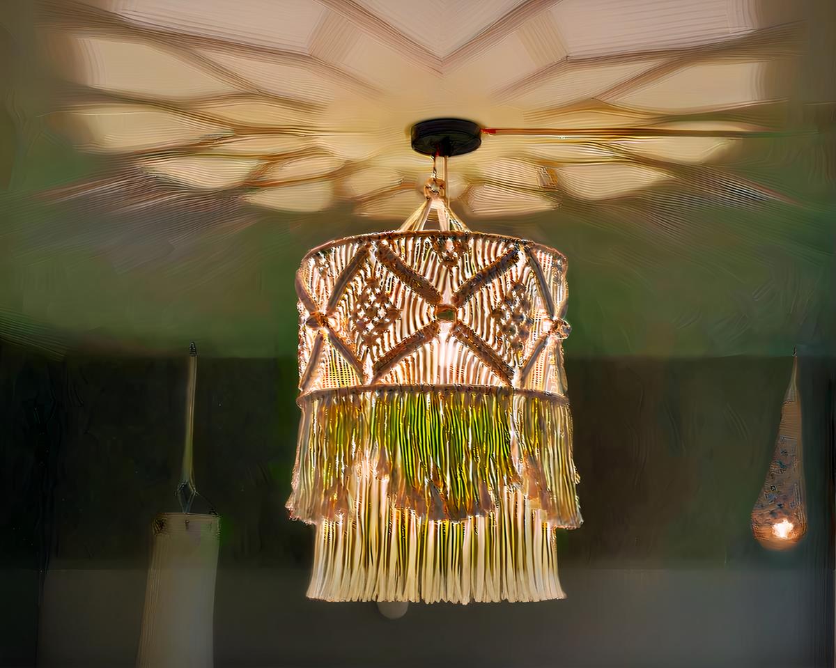 La suspension macramé blanche est votre alliée pour une ambiance douce et relaxante. Elle est conçue pour diffuser une lumière qui invite à la détente et à la contemplation, parfaite pour des soirées calmes ou pour un éclairage d'ambiance dans votre salon ou votre chambre.