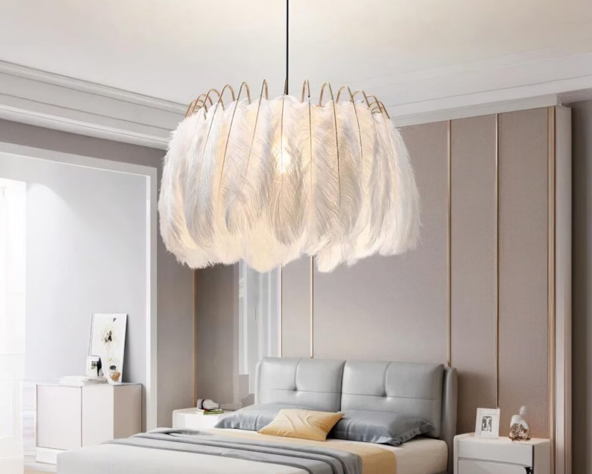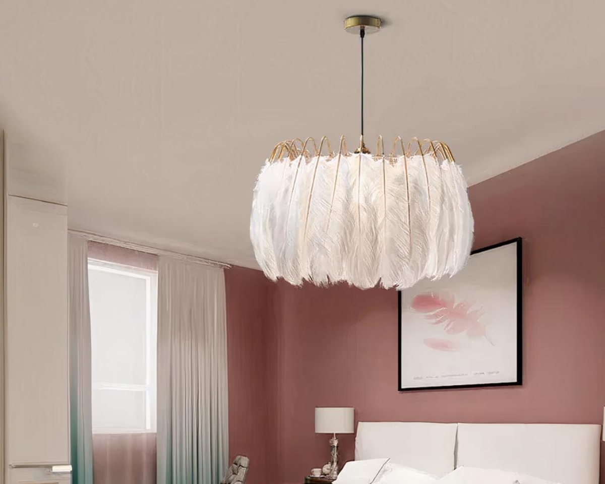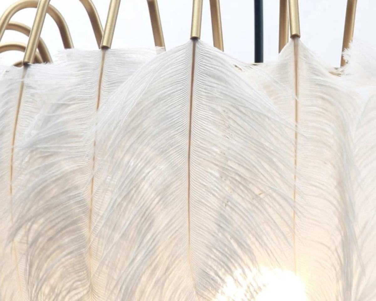 Introduisez un élément de décor luxueux avec cette suspension en plume et métal doré. Elle est parfaite pour ceux qui cherchent à combiner le confort moderne avec un esthétisme de haute couture, offrant un éclairage doux tout en servant de point focal décoratif.