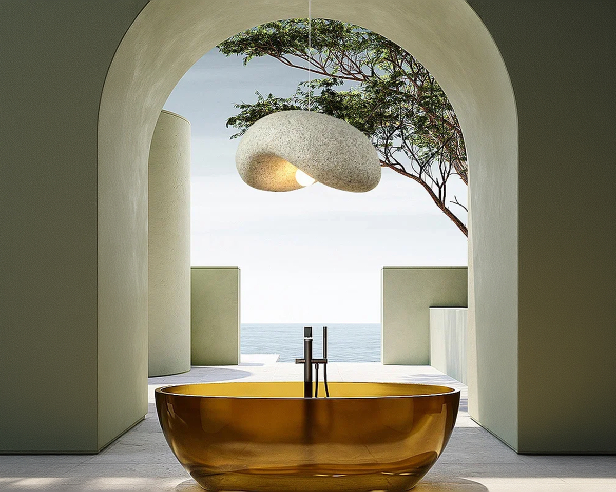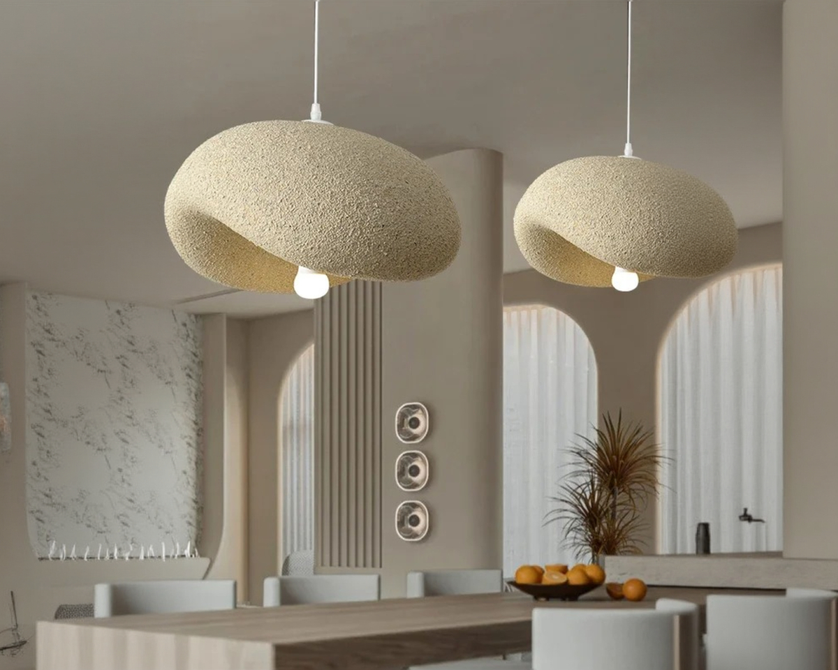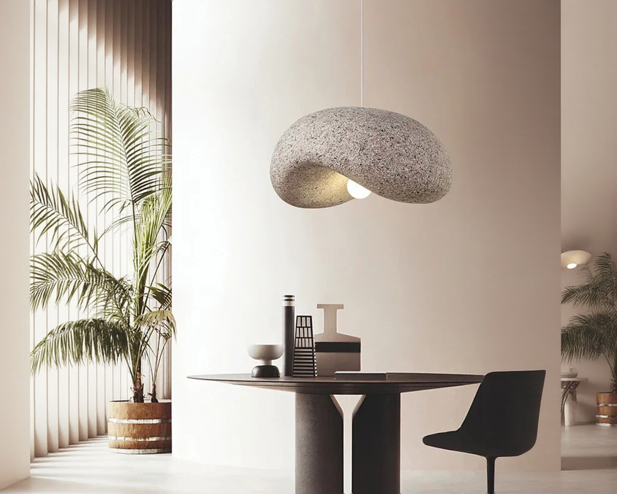 Suspendue dans l’espace comme un souffle minéral, cette suspension filaire sculpturale déploie ses courbes avec une élégance apaisante. Inspirée des galets façonnés par le temps, elle évoque les paysages zen du Japon et la beauté du silence.