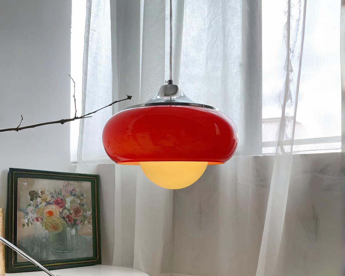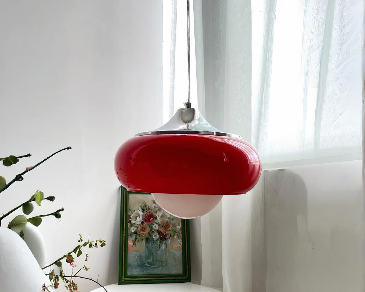 L'abat-jour en verre rouge de cette suspension s'accorde parfaitement avec divers styles décoratifs, des intérieurs modernes aux espaces plus traditionnels. Son design vintage est un excellent moyen d'ajouter du caractère et de l'authenticité à votre aménagement intérieur, tout en restant subtilement élégant.