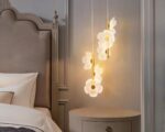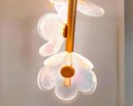 Créez un point focal captivant dans votre décoration avec cette suspension florale à deux têtes. Chaque tête suspendue arbore trois fleurs qui semblent flotter dans l'air, projetant une lumière qui accentue leur silhouette dorée et leur forme sophistiquée. Ce luminaire est idéal pour un intérieur cherchant à mélanger les influences artistiques avec le fonctionnalisme.