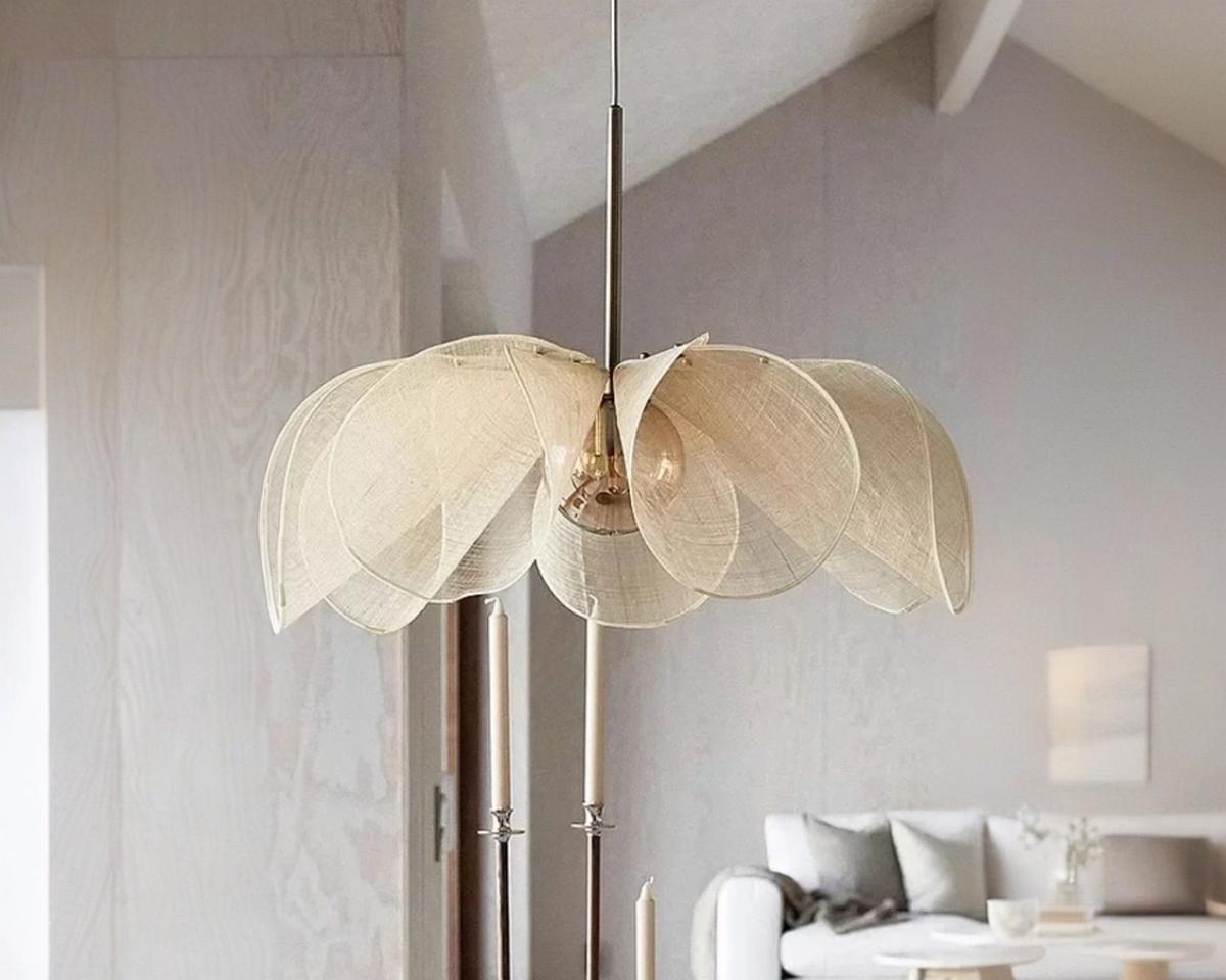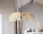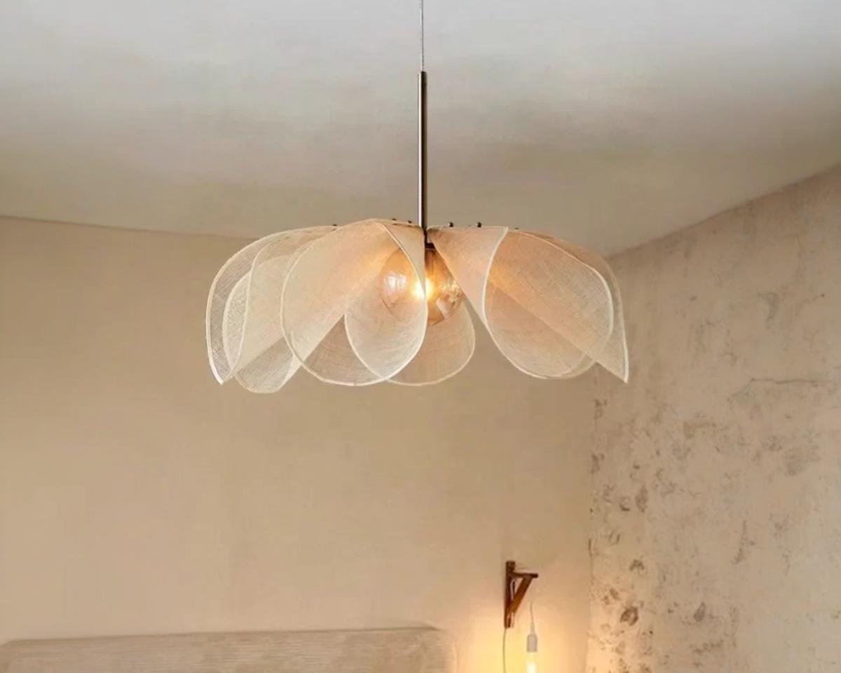 Cette suspension inspirée par le style japonais est conçue pour imiter la beauté naturelle et la simplicité des pétales. Idéale pour ceux qui cherchent à créer une ambiance reposante, elle associe la douceur du tissu à la solidité du fer, évoquant une sensation de paix et de bien-être.