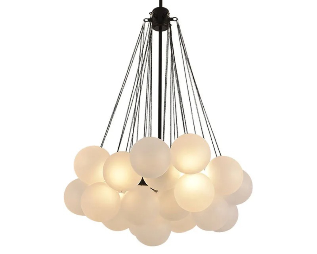 Malgré son apparence volumineuse, la suspension grappe décorative et originale en pierre de verre se fond harmonieusement dans n'importe quel espace, ajoutant une touche de légèreté. Son design suspendu en hauteur crée une impression de flottement, tout en conservant une allure majestueuse. Ce contraste subtil entre la légèreté et la grandeur en fait une pièce maîtresse.