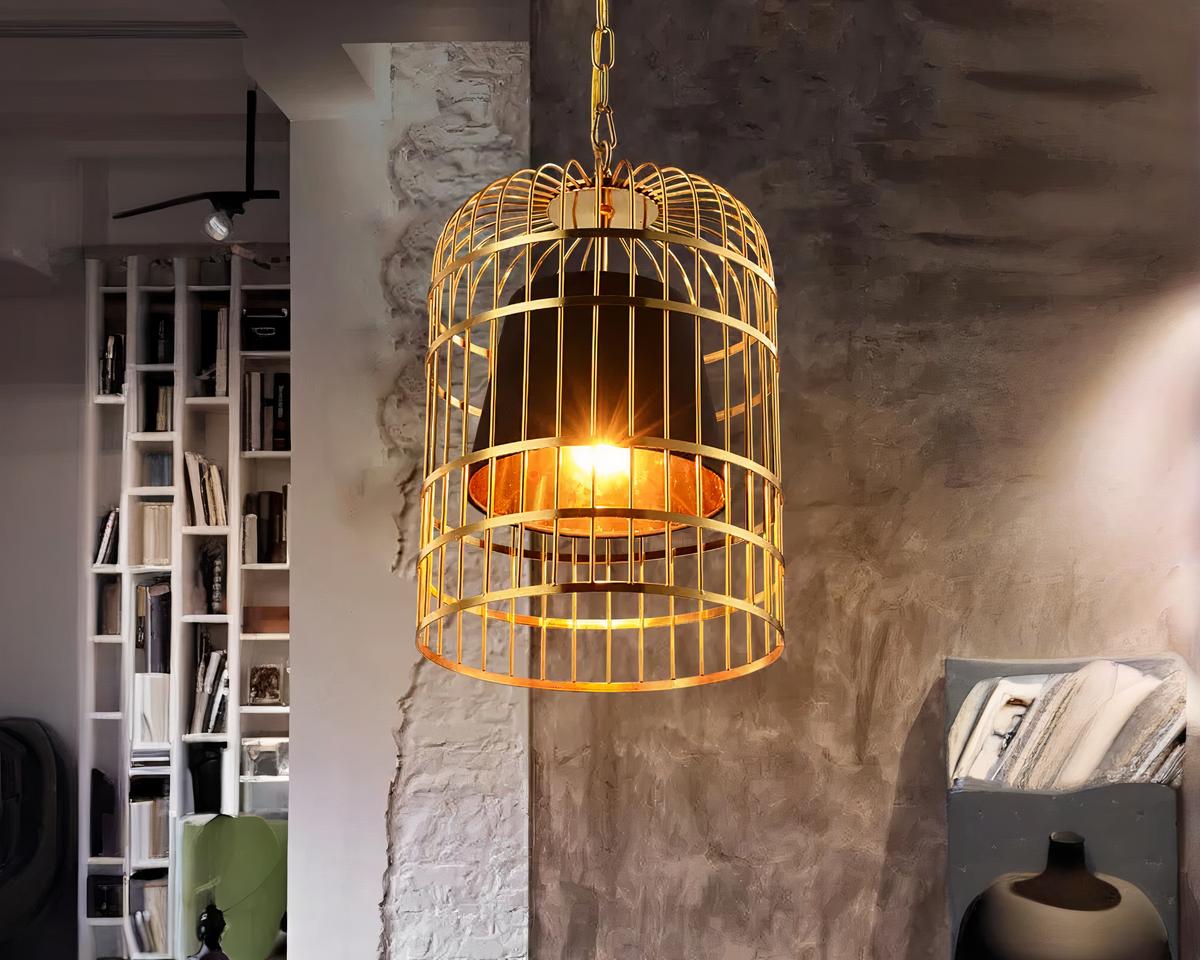 Suspension cage oiseau LED dorée avec abat-jour noir
