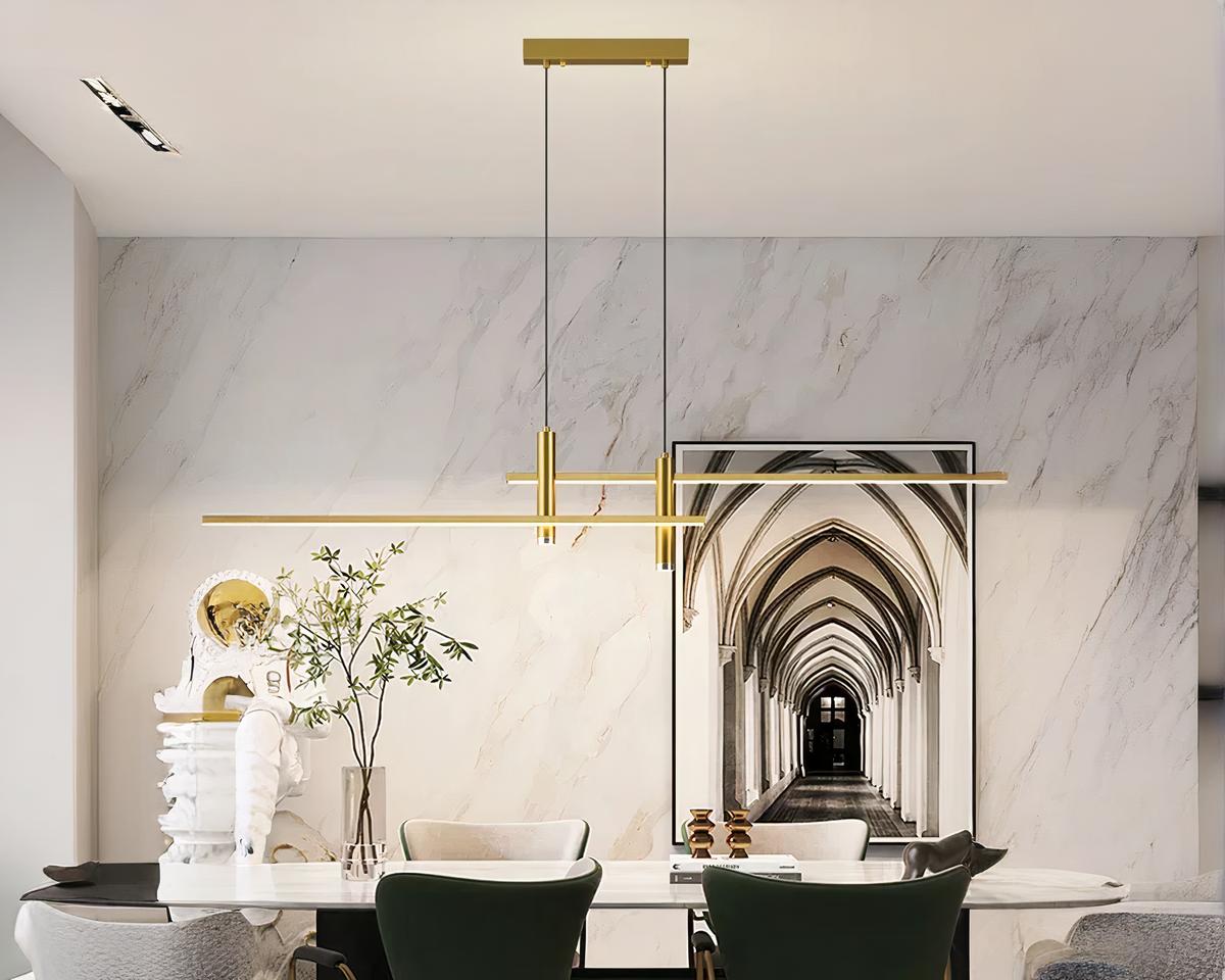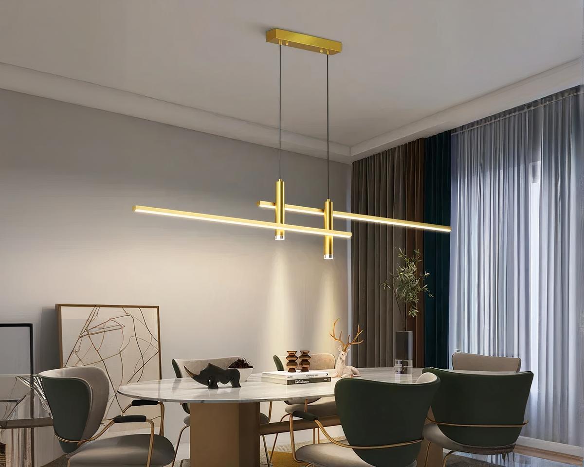 Cette suspension double tête en aluminium doré allie fonctionnalité et style. Grâce à sa construction robuste en aluminium et ses LEDs efficaces, elle offre une solution d'éclairage durable. Le design unique en forme de barre ajoute une dimension architecturale qui complémente les intérieurs contemporains ou minimalistes.
