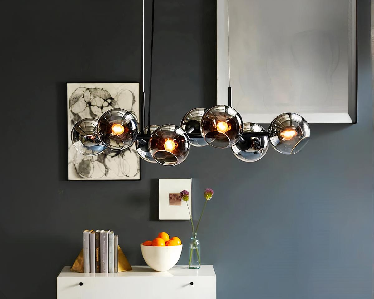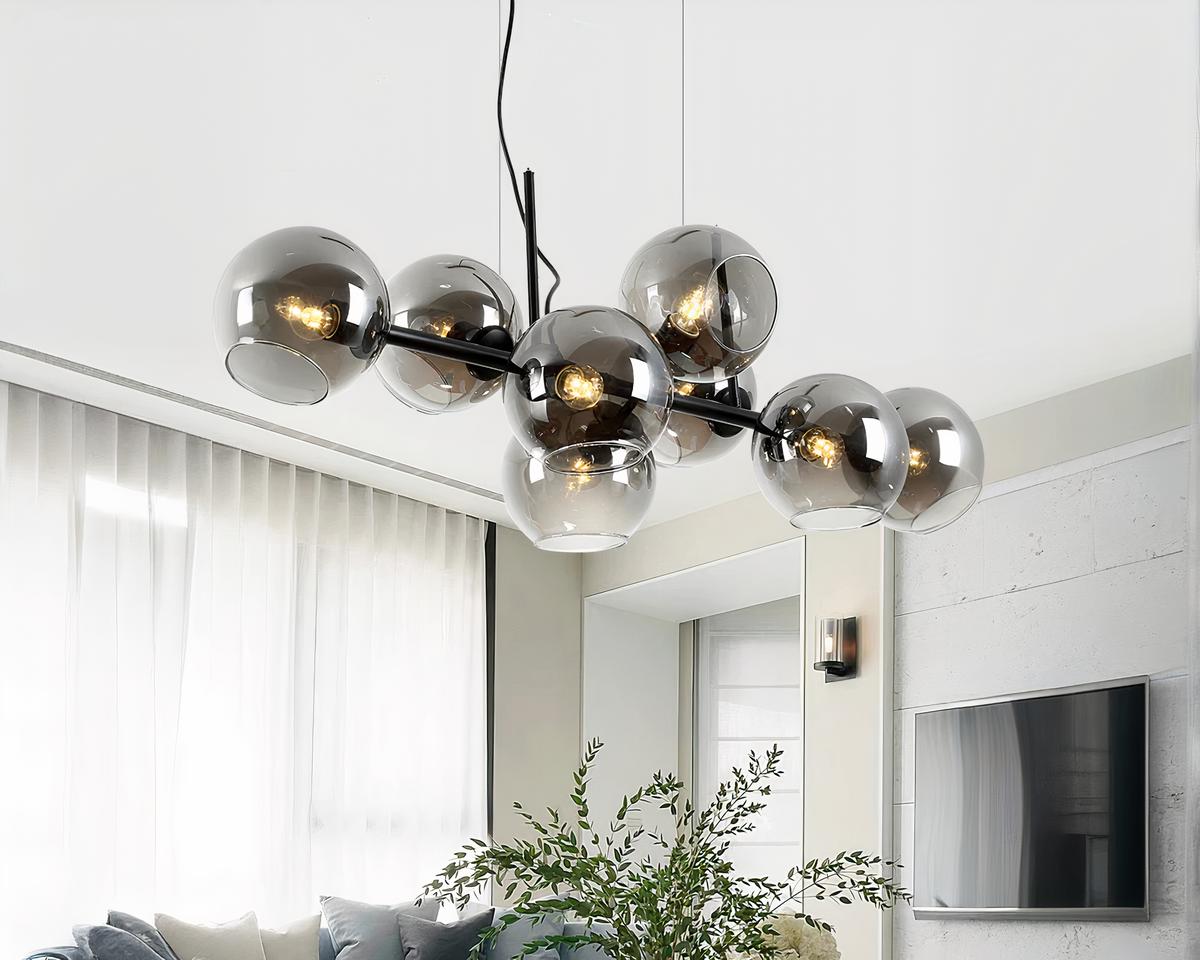 Chaque sphère de cette suspension verre fumé joue avec la lumière pour offrir une diffusion subtile et apaisante, parfaitement adaptée à une variété de décors, des plus modernes aux classiques revisités. La teinte noire et transparente des globes offre un contraste dramatique qui enrichit n'importe quel espace de vie ou de travail.