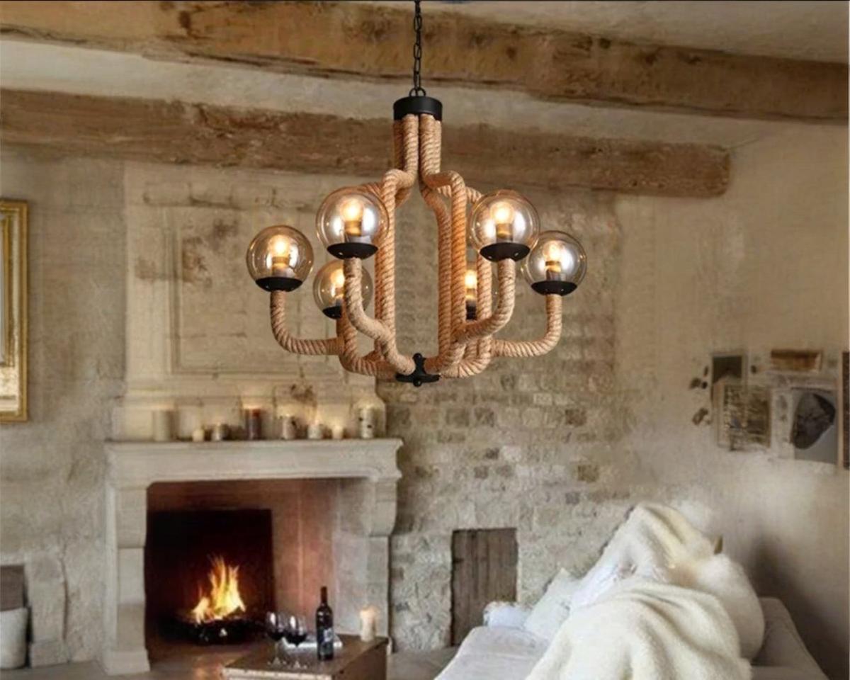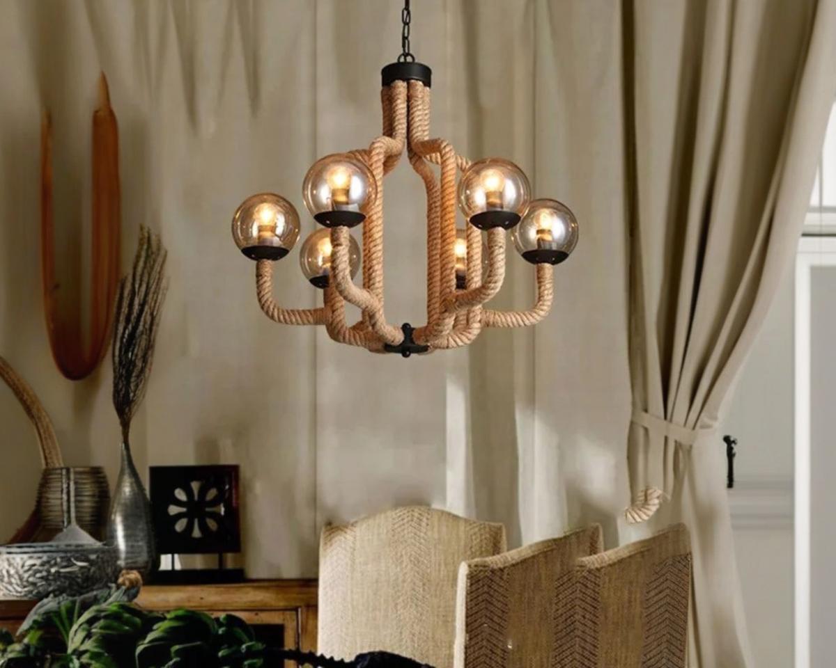 Avec ses cordes enroulées autour de sa structure et ses globes en verre transparent, cette suspension offre un contraste saisissant entre tradition et modernité. Les cordes naturelles évoquent un style rustique, tandis que les globes apportent une touche contemporaine. Parfait pour ceux qui aiment jouer avec les textures dans leur décoration, ce luminaire ajoutera une touche de caractère à n’importe quelle pièce.