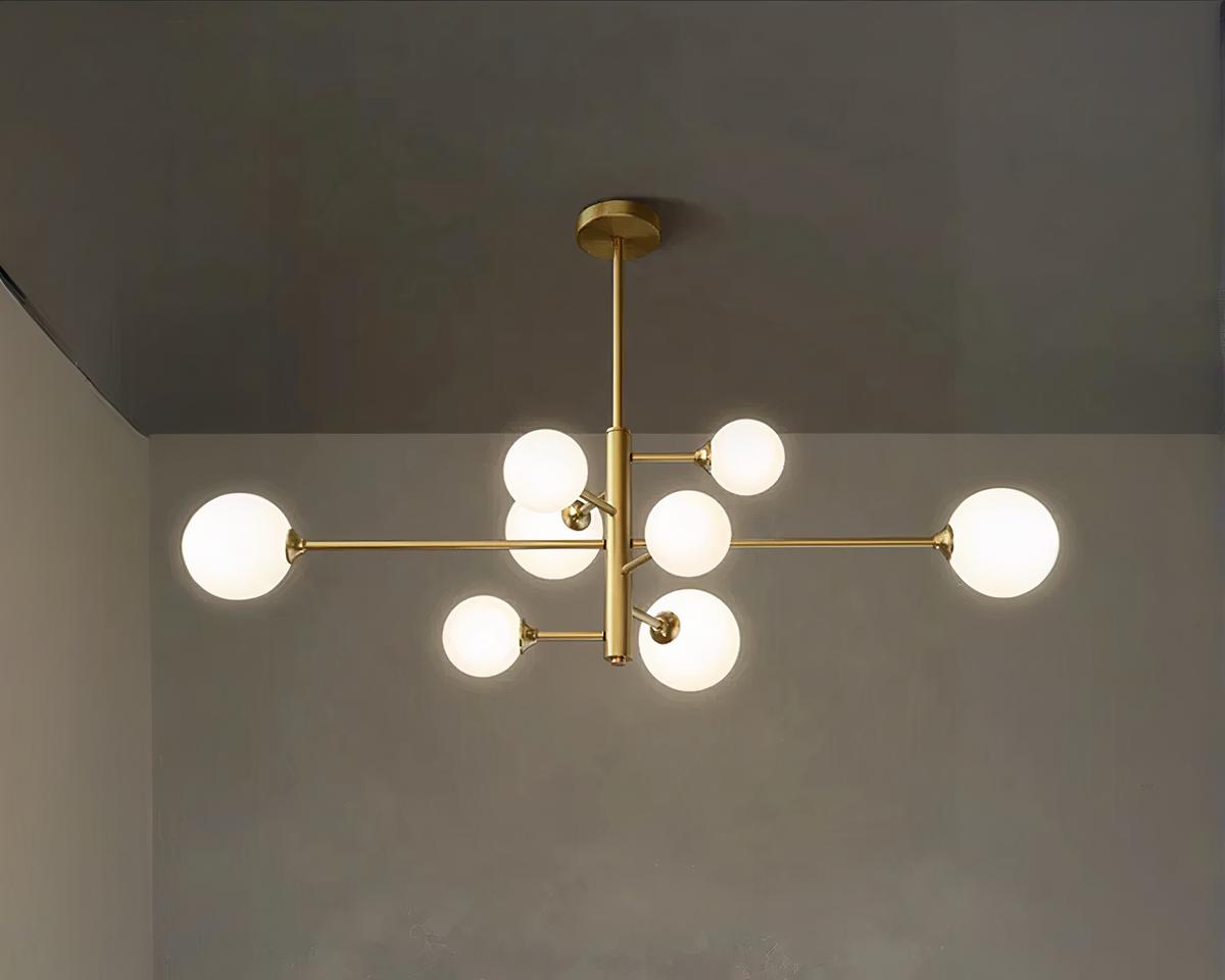 Cette suspension décorative marie l'art et la fonctionnalité avec ses huit boules en verre doré. Chaque boule est suspendue à des hauteurs variées, dispersant la lumière de manière à créer un effet visuel captivant et chaleureux, parfait pour améliorer l'ambiance de salles à manger ou salons.