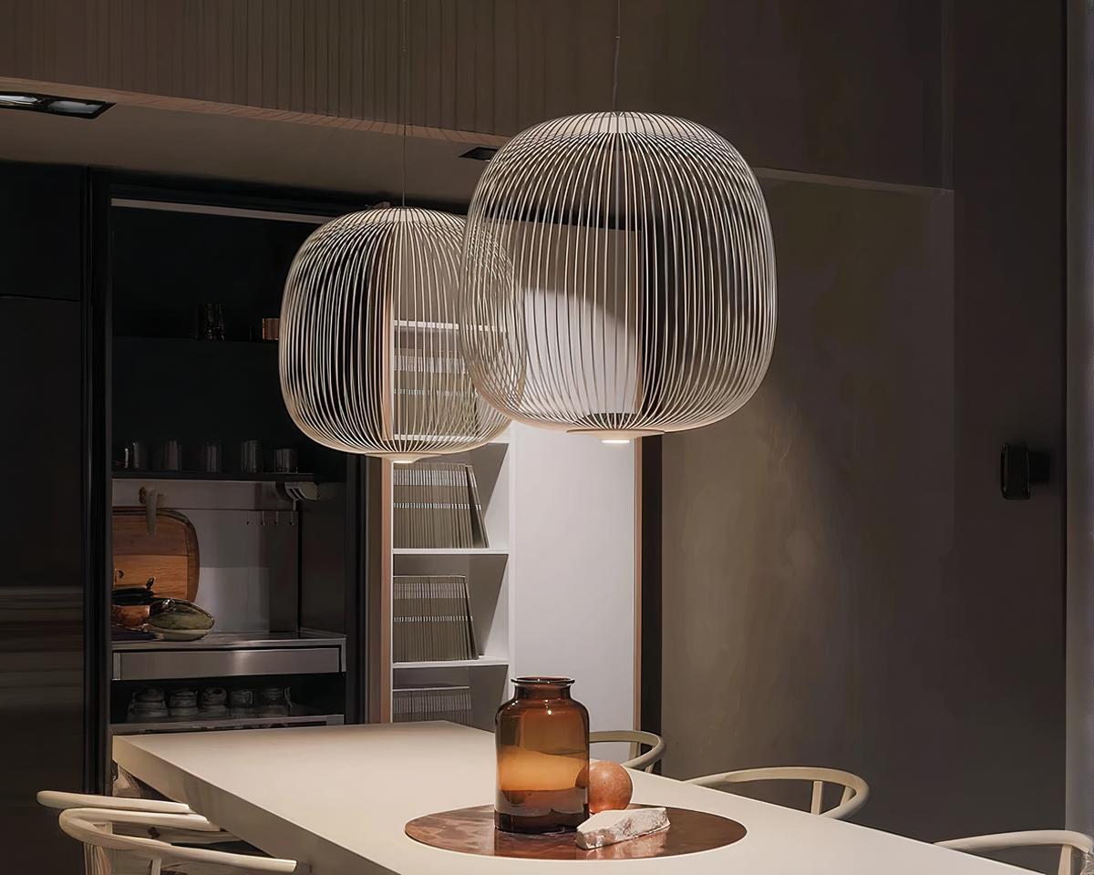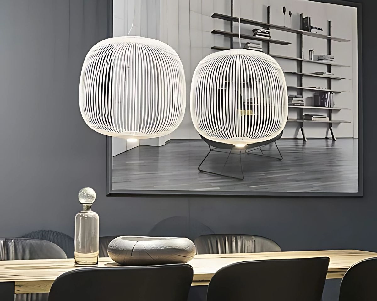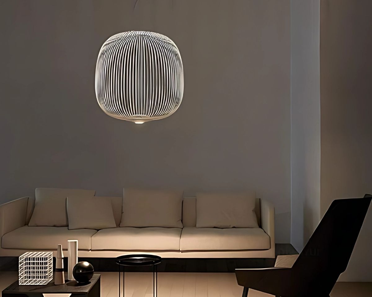 Cette suspension cage oiseau blanche allie un style contemporain à une structure aérienne, créant un effet visuel unique. Sa forme en alliage léger rappelle une cage délicate, pendant que sa teinte blanche neutre la rend adaptable à tous les décors.