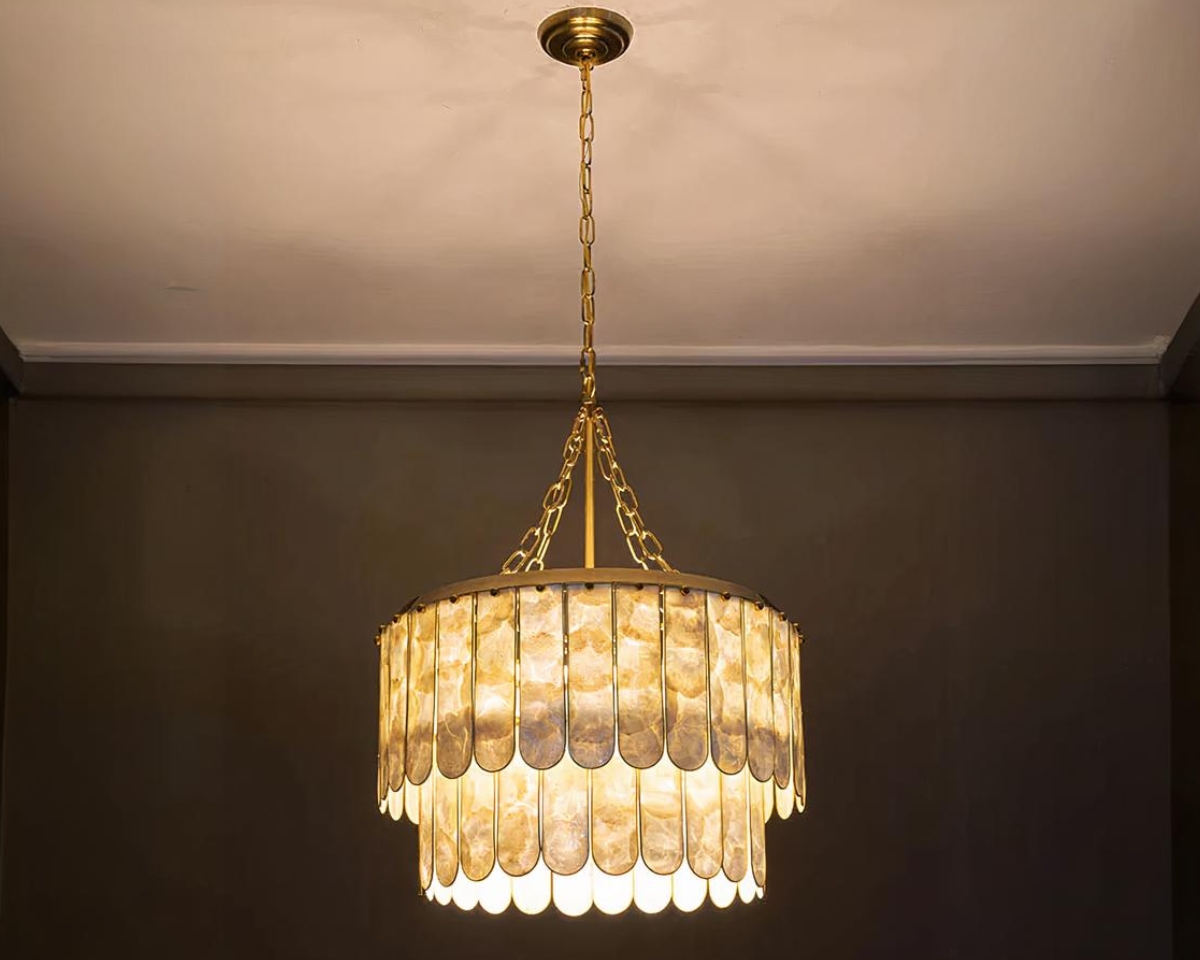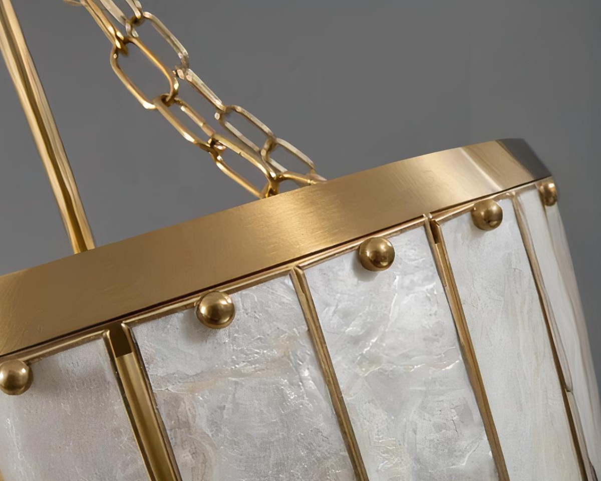 Introduisez cette suspension en coquillage et cuivre dans votre espace pour un effet immédiatement luxueux. Son design chandelier évoque l'opulence, tandis que les détails en coquillage ajoutent une touche d'élégance naturelle, idéale pour les salons ou les zones de réception prestigieuses.