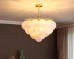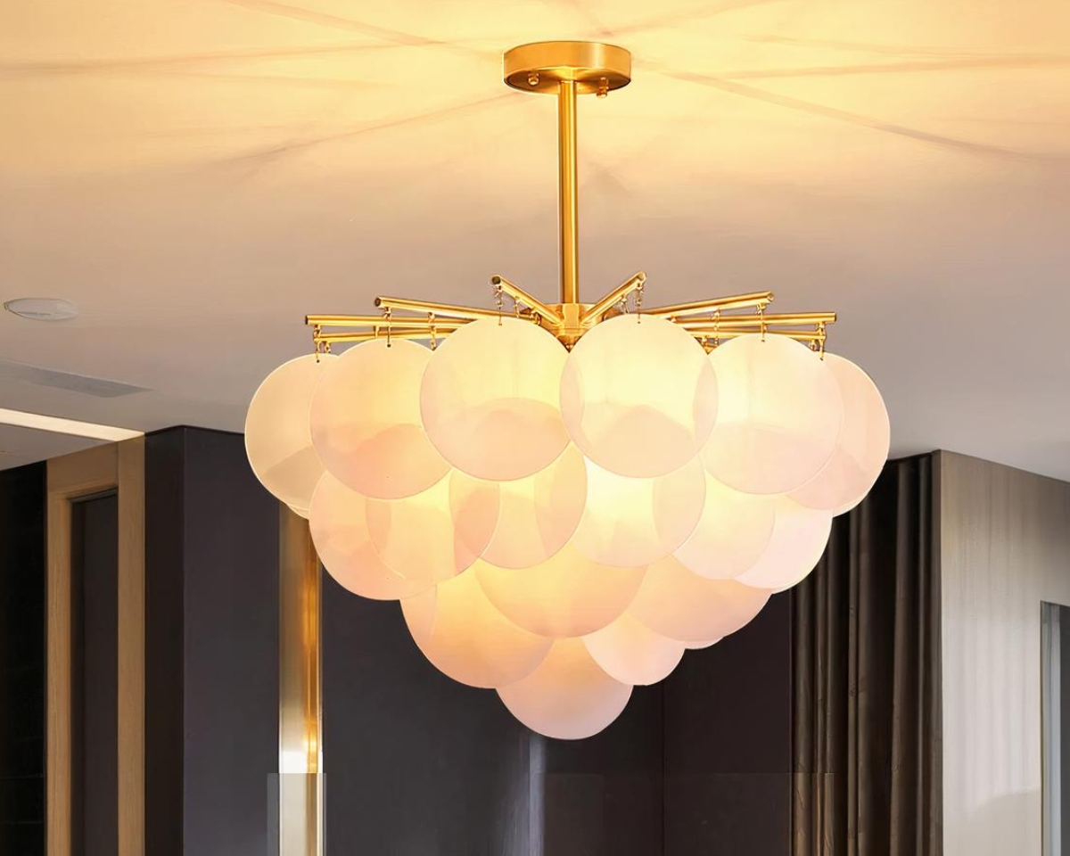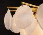 Cette suspension décorative intègre des formes de coquillage en verre suspendues qui évoquent la douceur de la mer. Parfaite pour ceux qui désirent un éclairage non seulement fonctionnel mais aussi capable d'ajouter un aspect artistique à l'espace, grâce à son design moderne et ses finitions dorées.