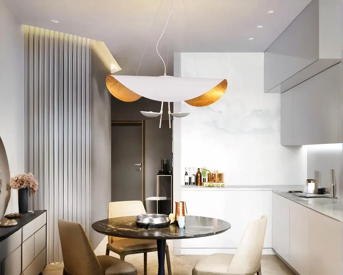 Cette suspension n'est pas juste une source de lumière, elle est une pièce de décoration audacieuse. Sa forme rappelant un chapeau plié et son éclairage LED intégré offrent une combinaison parfaite de fonctionnalité et de style artistique. Utilisez-la pour créer un point focal dans des espaces minimalistes ou contemporains.