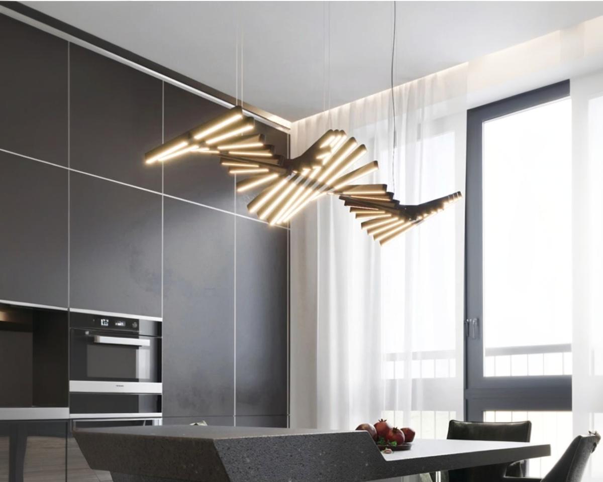 Cette suspension n'est pas juste un appareil d'éclairage, elle est une installation artistique qui élève le style de tout intérieur. Ses éléments lumineux, rappelant des ailes en mouvement, projettent des jeux de lumière fascinants et dynamiques. La structure, minimaliste et moderne, s'intègre harmonieusement dans des environnements contemporains, enrichissant visuellement des salons, halls d'entrée ou zones de réception.