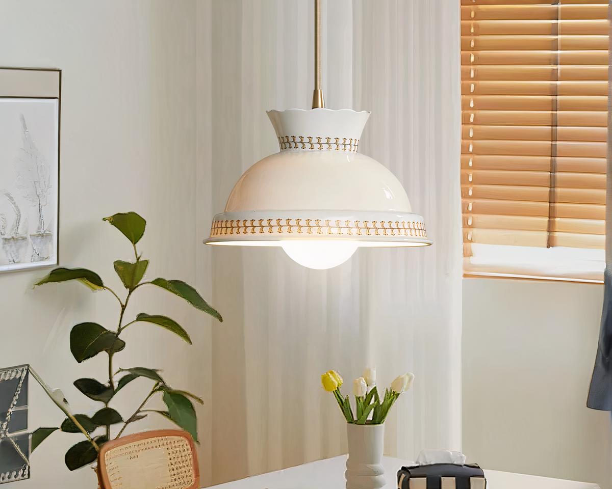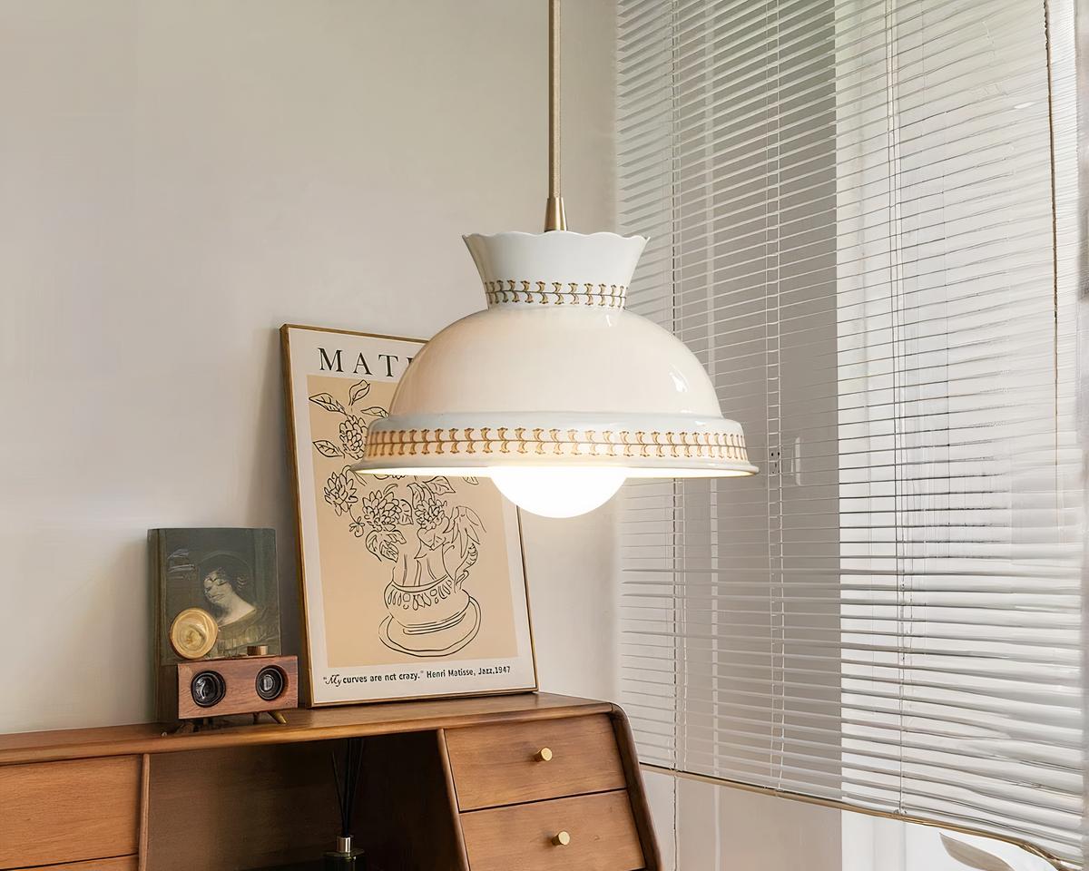 Rafraîchissez l'ambiance de votre salle de bain avec cette suspension en céramique blanche, dotée d'accents en cuivre. Son design moderne et sa couleur lumineuse illuminent votre espace, offrant une lumière douce qui enchante et relaxe. C'est le choix parfait pour une salle de bain où le calme et la beauté sont essentiels.