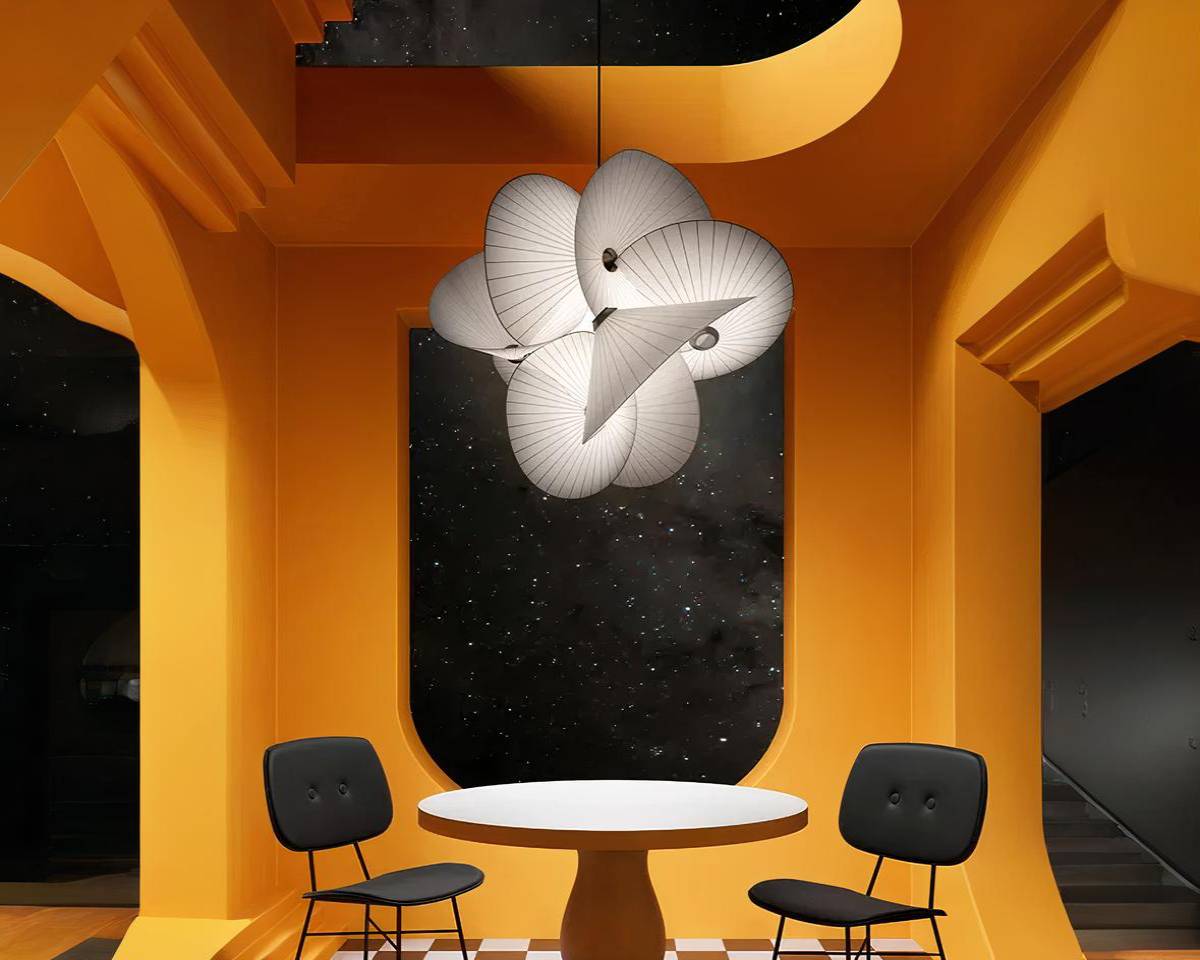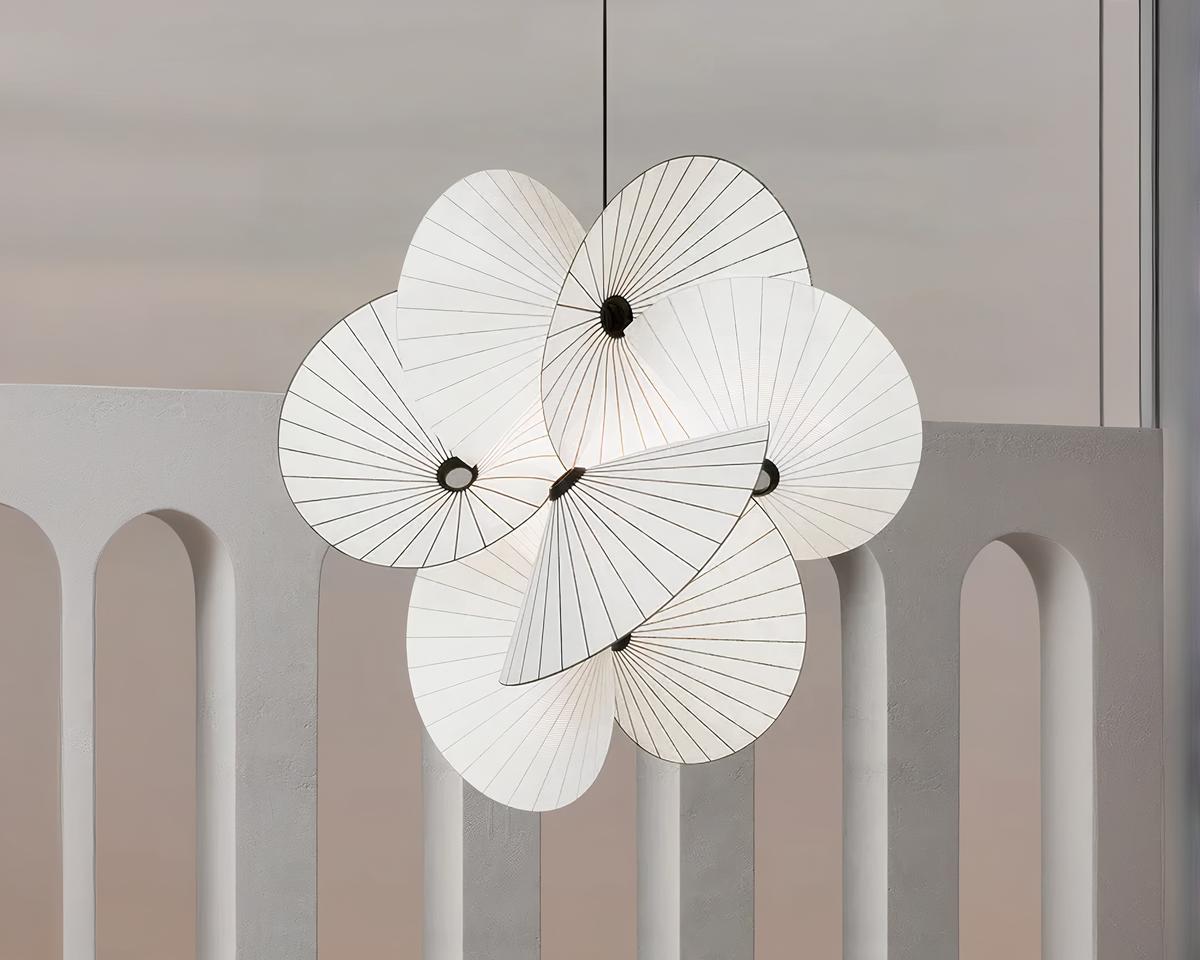 Cette suspension non conventionnelle captivant l'œil avec sa configuration de chapeaux en tissu crée une atmosphère pleine de charme et de créativité. Parfait pour infuser un peu de magie et d'originalité dans des espaces qui célèbrent l'unicité et l'art décoratif.