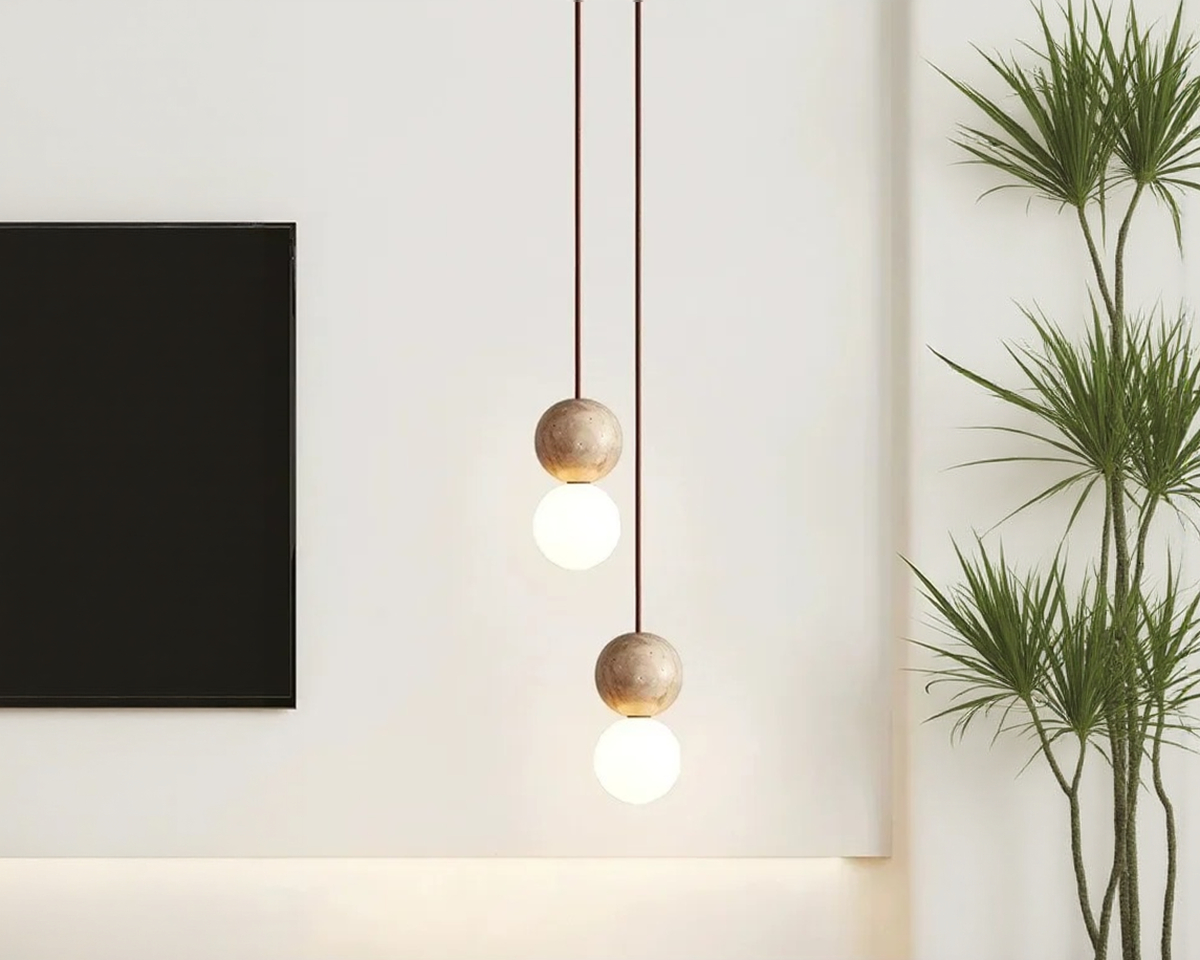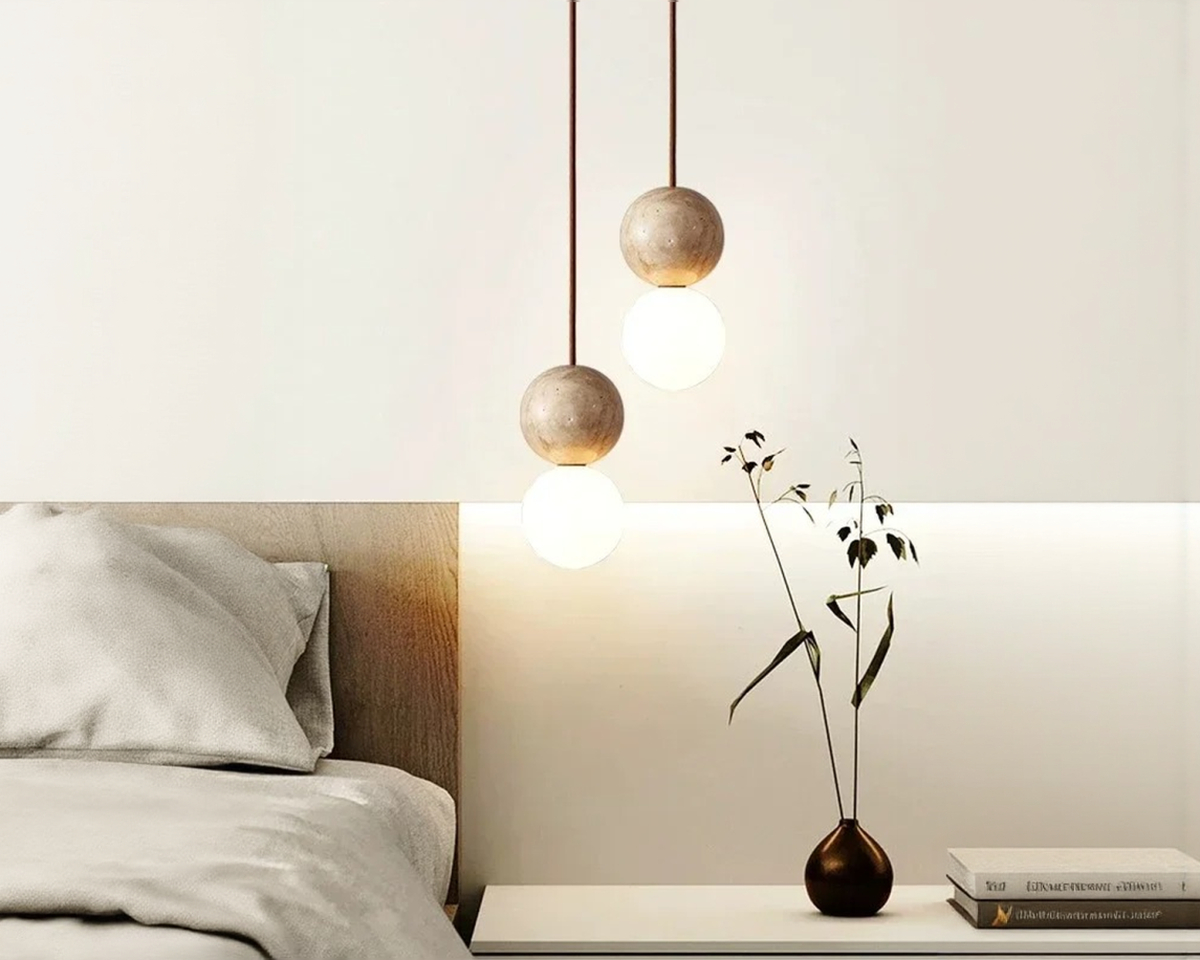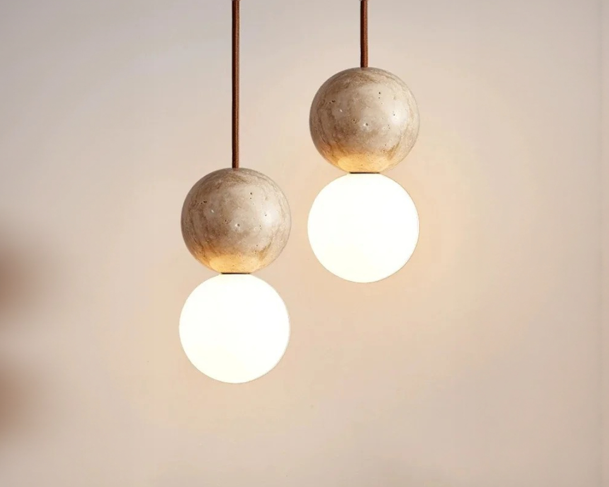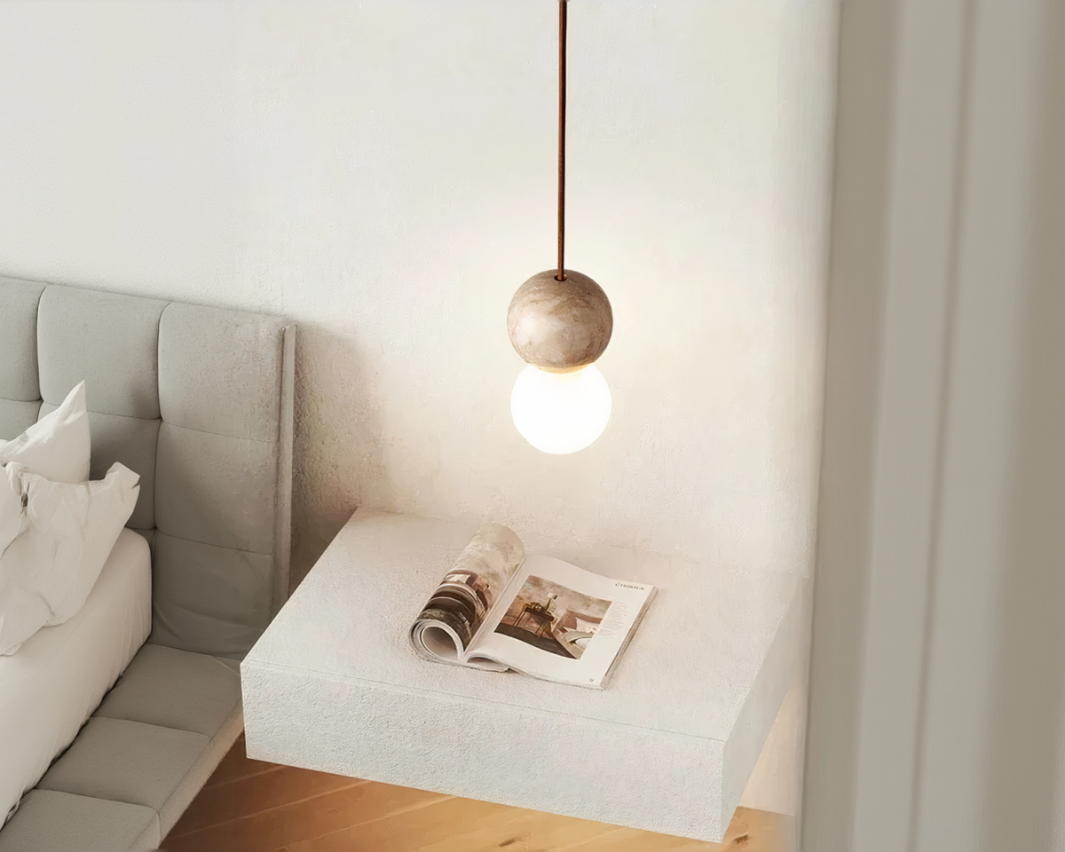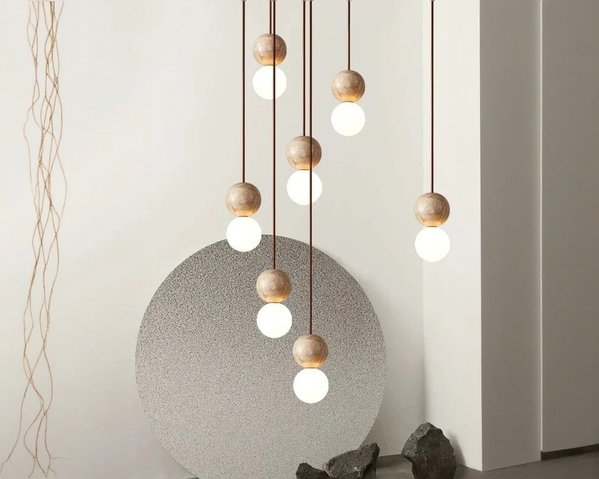 Vous ne cherchez pas à meubler l’espace, vous cherchez à le rythmer. Cette suspension Japandi globe joue le contraste : pierre brute, verre satiné, tension entre pesanteur et légèreté. Elle ne décrit rien. Elle suggère.