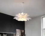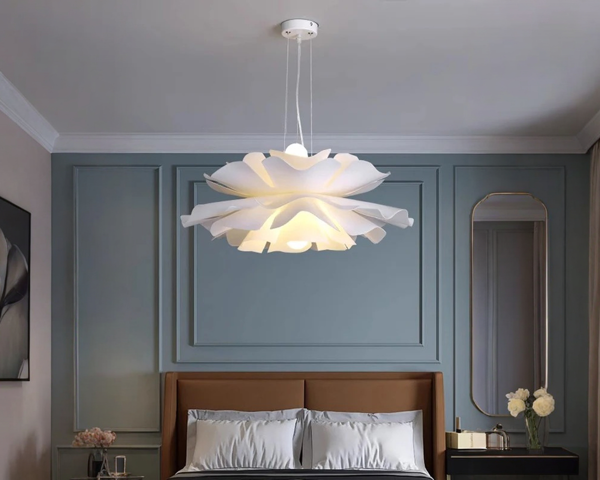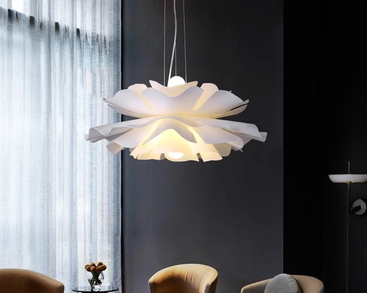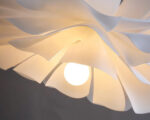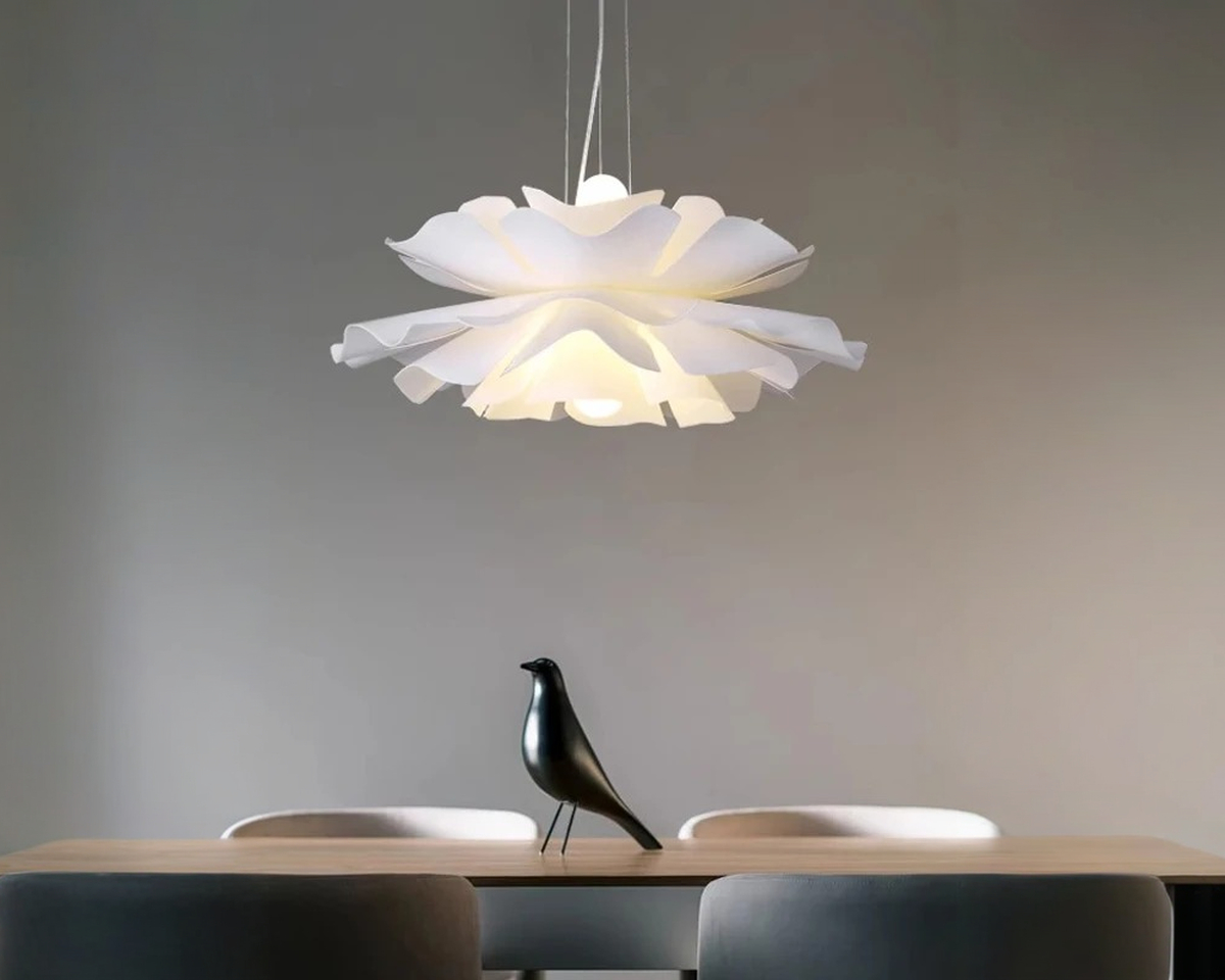 Suspendue comme en lévitation, cette suspension évoque la délicatesse d’un pétale en pleine éclosion. Chaque ondulation diffuse une lumière douce, enveloppante, presque silencieuse. Elle ne cherche pas à briller : elle apaise.