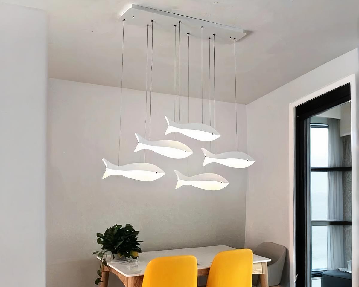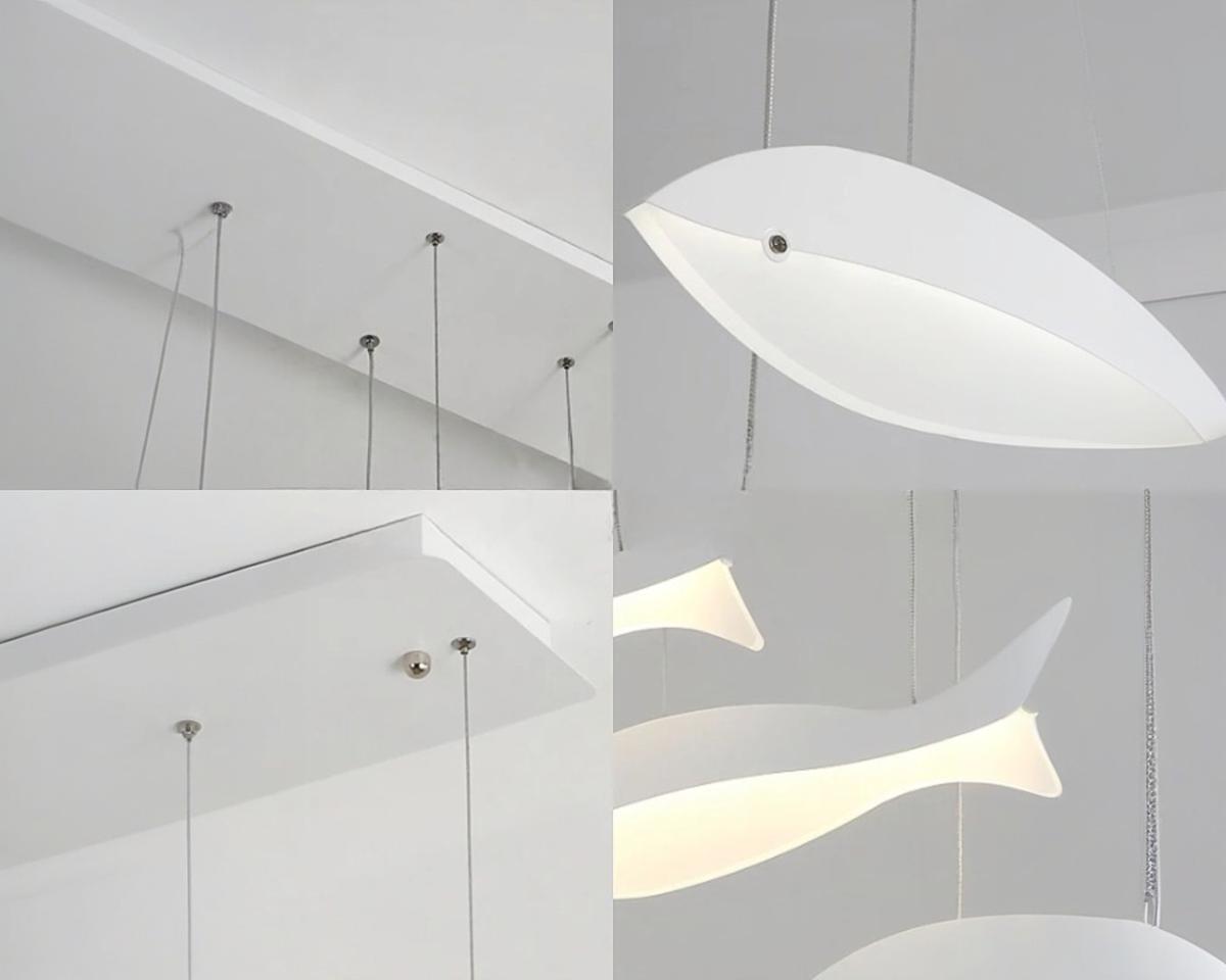 Cette suspension n'est pas seulement une source de lumière; elle est une pièce d'art. Avec ses cinq poissons en acrylique blanc flottant élégamment dans l'air, elle apporte un dynamisme visuel à tout espace de vie, reflétant un sens du mouvement et de la fluidité qui est à la fois captivant et apaisant.