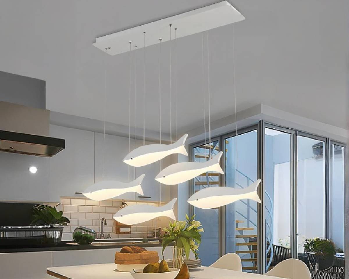 Adoptez une décoration audacieuse avec cette suspension moderne qui intègre cinq poissons blancs comme éléments centraux. Leur conception en acrylique associée à la solidité du fer forme un contraste saisissant qui attire l'œil, offrant à la fois un éclairage efficace et un fort impact décoratif.