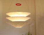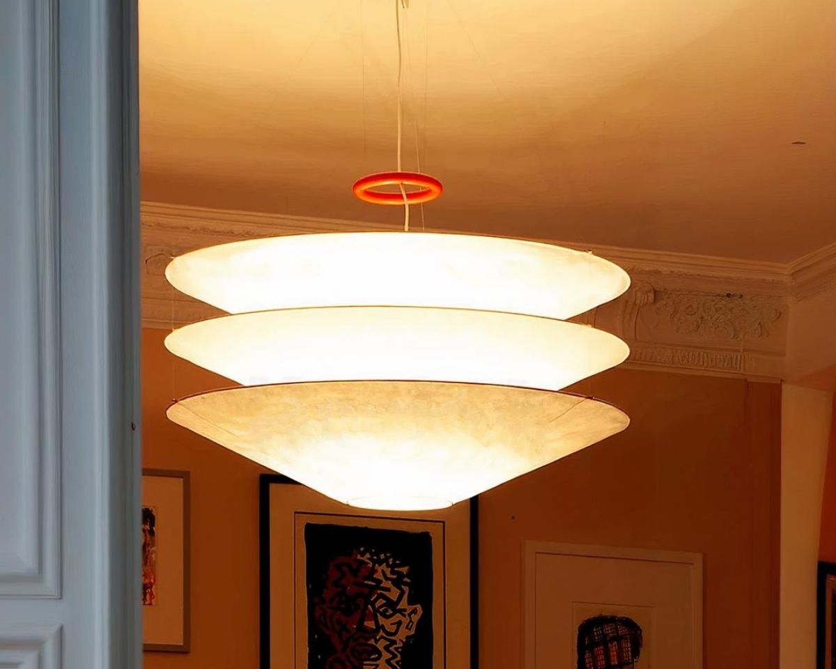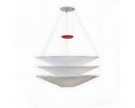 Cette suspension présente un design où l'accumulation de formes contribue à un rendu esthétique puissant. L'arrangement des trois chapeaux inversés en papier offre non seulement une source lumineuse ample, mais aussi un objet d'art moderne, parfait pour une mise en scène dans des espaces ouverts.