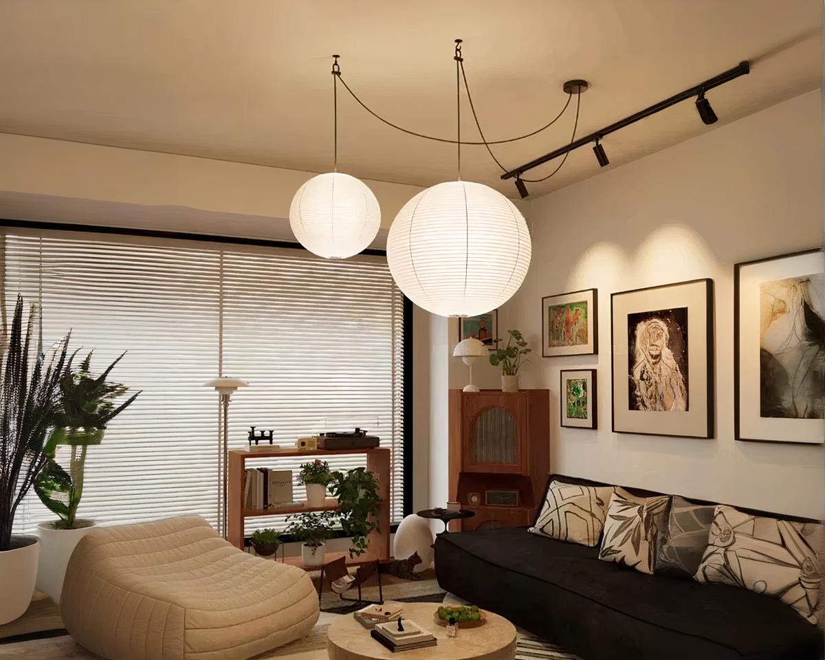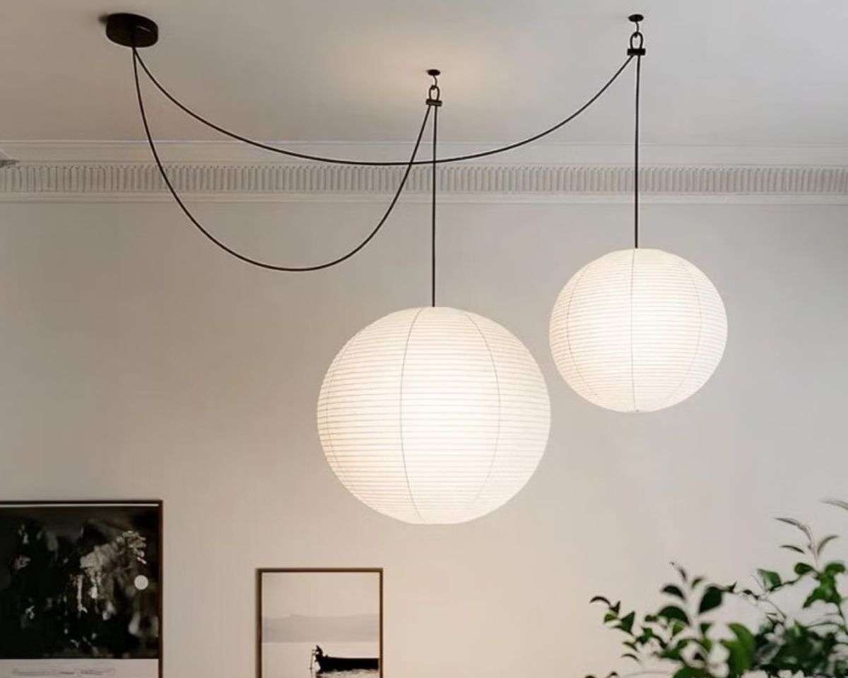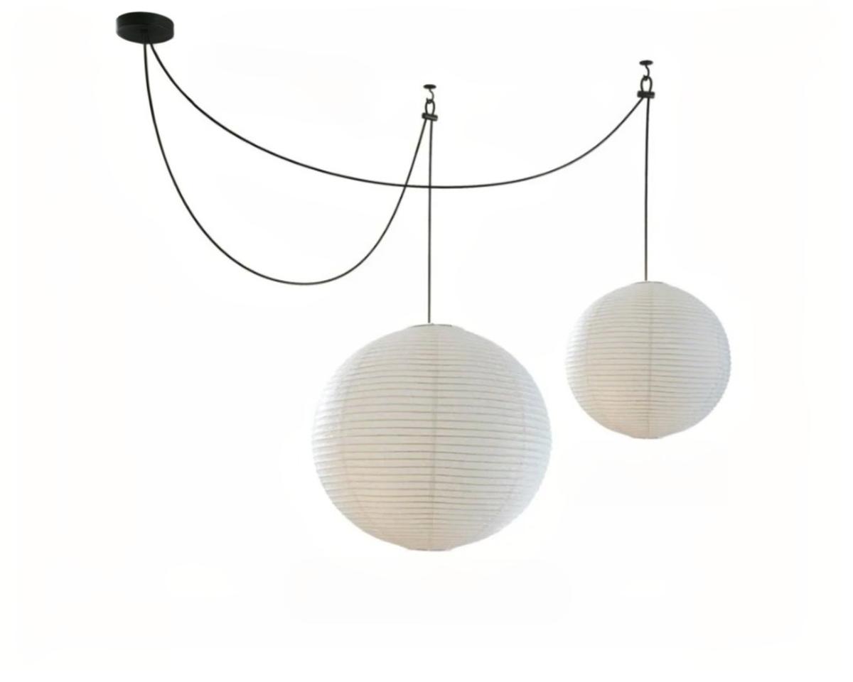 Intégrez cette suspension à votre espace pour profiter de son esthétique minimaliste qui allie beauté et fonctionnalité. Les deux sphères en papier créent un jeu de lumières fascinant, idéal pour des pièces comme le salon ou la chambre où une atmosphère calme est recherchée.