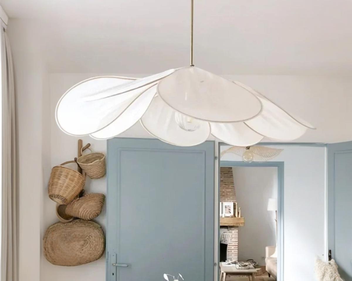 Rafraîchissez votre espace avec cette suspension en tissu blanc, dont la conception en forme de pétale ajoute une touche de légèreté et d'élégance contemporaine. Idéale pour les intérieurs qui cherchent à mêler simplicité et modernité, elle offre un éclairage chaleureux qui invite à la détente et à la contemplation.
