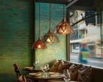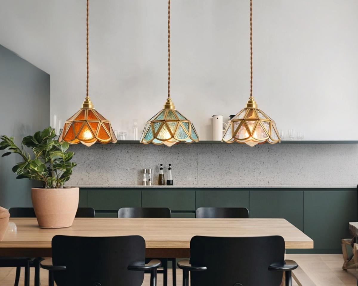 La suspension en verre coloré vintage est un hommage aux designs classiques des décennies passées. Chaque verre teinté diffuse une lumière douce et colorée, transportant instantanément votre espace dans une époque où le style et l'élégance étaient essentiels. Ce luminaire est parfait pour ceux qui souhaitent introduire un élément décoratif qui allie fonctionnalité et esthétique rétro. Cette suspension attire les regards et devient un sujet de conversation, grâce à son charme authentique et son design distinctif.