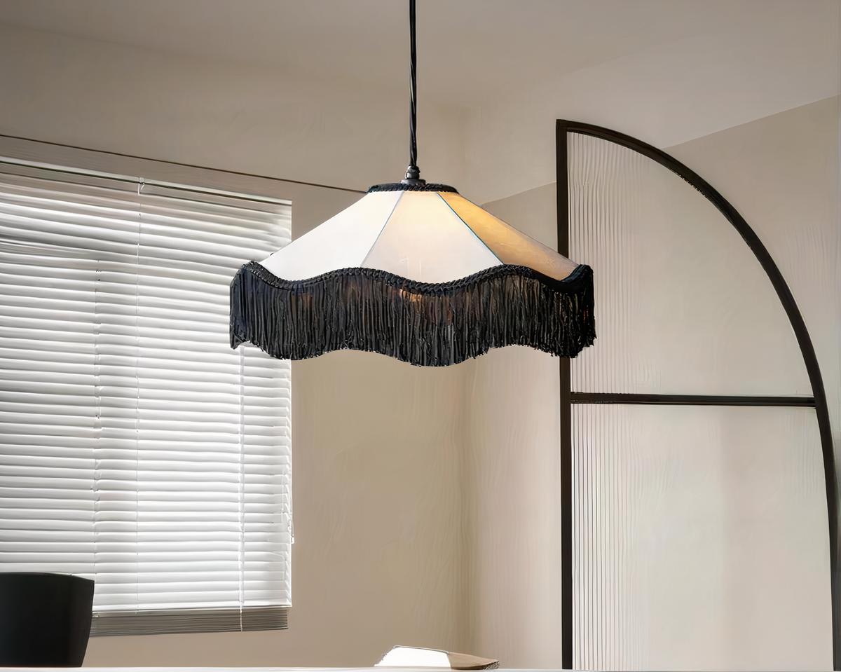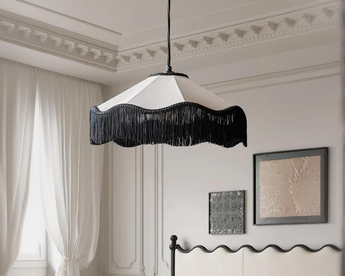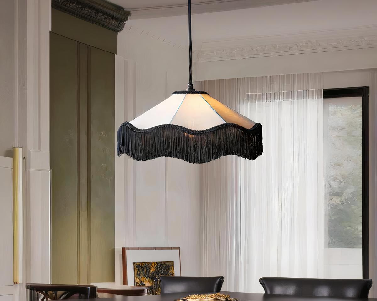 Cette suspension est conçue avec une attention méticuleuse portée aux détails, utilisant des matériaux de première qualité pour garantir à la fois la durabilité et un style somptueux. Les franges élégamment disposées et la palette de couleurs neutres accentuent tout espace avec un air de grandeur classique, offrant une ambiance à la fois classique et élégante qui s'intègre harmonieusement dans divers décors.