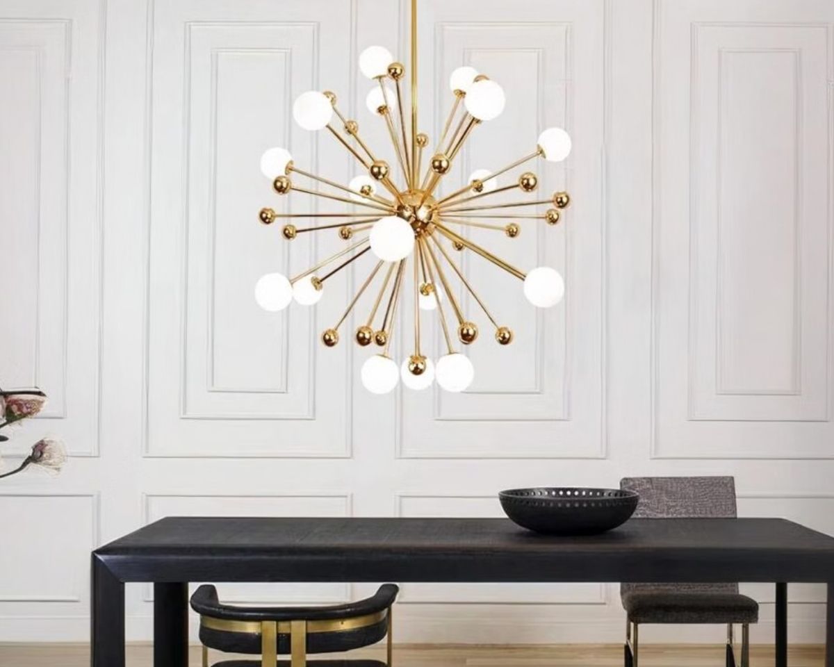 La conception de cette suspension est un mariage réussi entre l'élégance et l'innovation. Les globes en verre, judicieusement répartis sur les branches dorées, captent et capturent la lumière pour un effet scintillant et étendu. Parfait pour les espaces qui recherchent à la fois un éclairage puissant et une pièce artistique, ce modèle s'intègre avec brio dans un cadre contemporain ou classique chic.